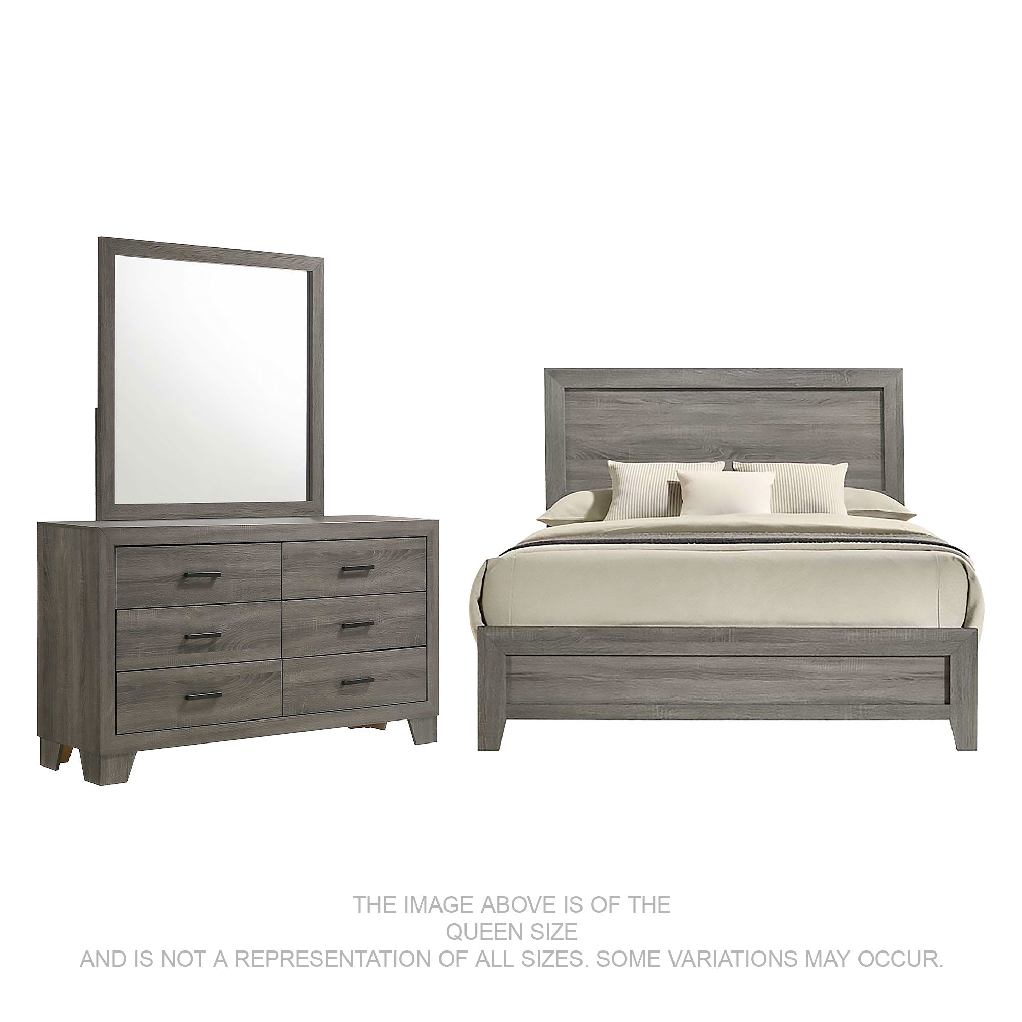 Transform your bedroom into a serene retreat with the Ashland Queen Panel Bed and Mirrored Dresser Set. This stylish ensemble features a clean-lined panel bed paired with a six-drawer dresser topped with a matching mirror, all finished in a rustic grey hue that adds a modern yet cozy touch to any decor. The bed’s sturdy frame and the dresser’s ample storage provide both comfort and functionality, making this set an ideal choice for a contemporary home.