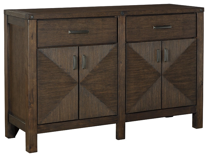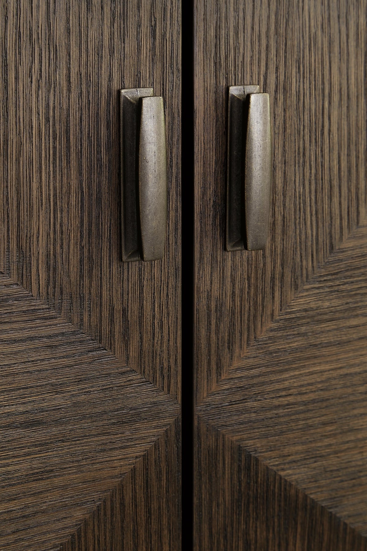 Feast your eyes on this server. Craftsman details include mortise and tenon styling and an exquisite diamond-pattern veneer inlay. If storage is an issue, two roomy cabinets and two smooth gliding drawers make entertaining a breeze.