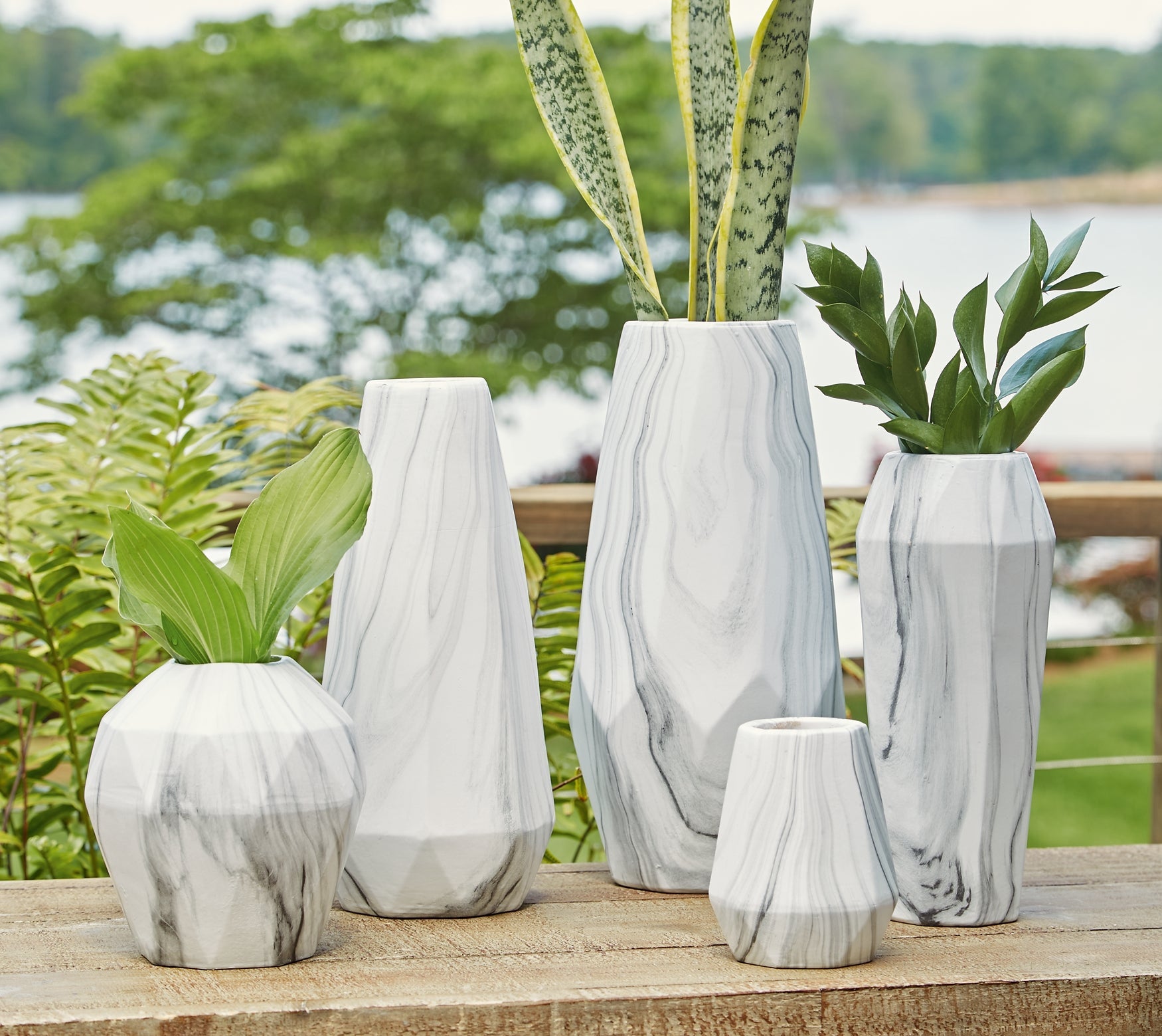 | Details | Includes 5 vases, Made of ceramic, Glazed faux marble finish, Made for indoor/outdoor use | |