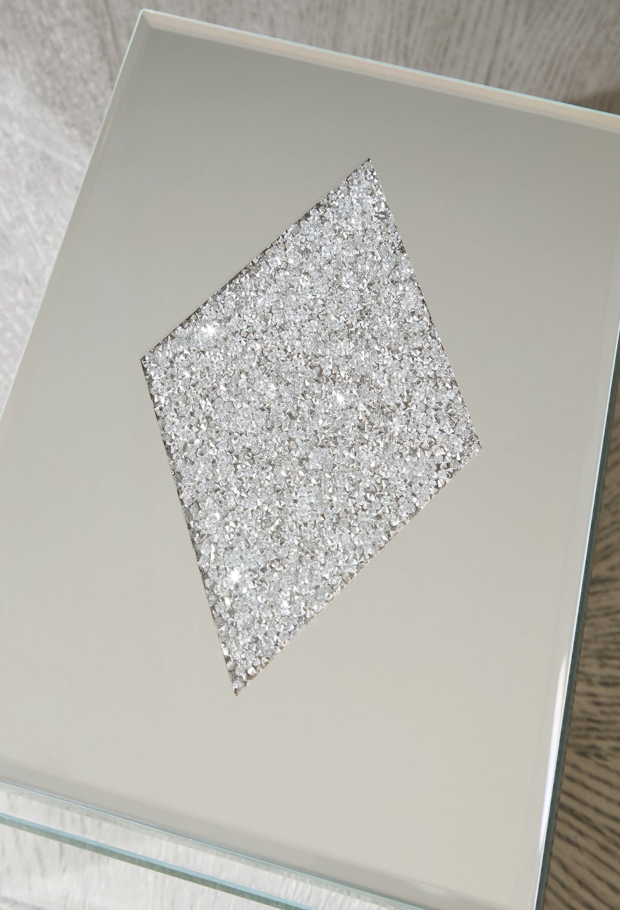 | Details | Set of 2, Cut-glass mirror with ¼" bevel, Acrylic beads, Black cotton lining | |