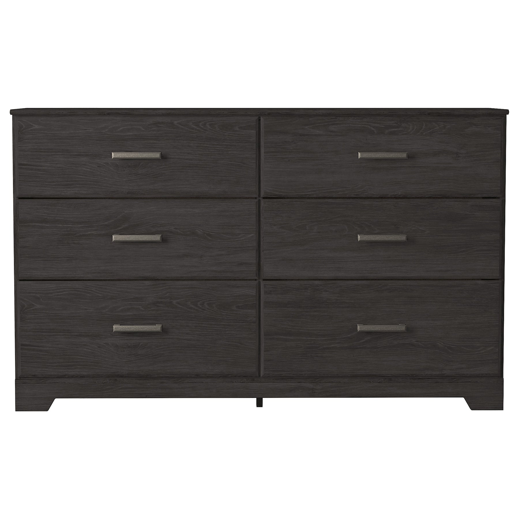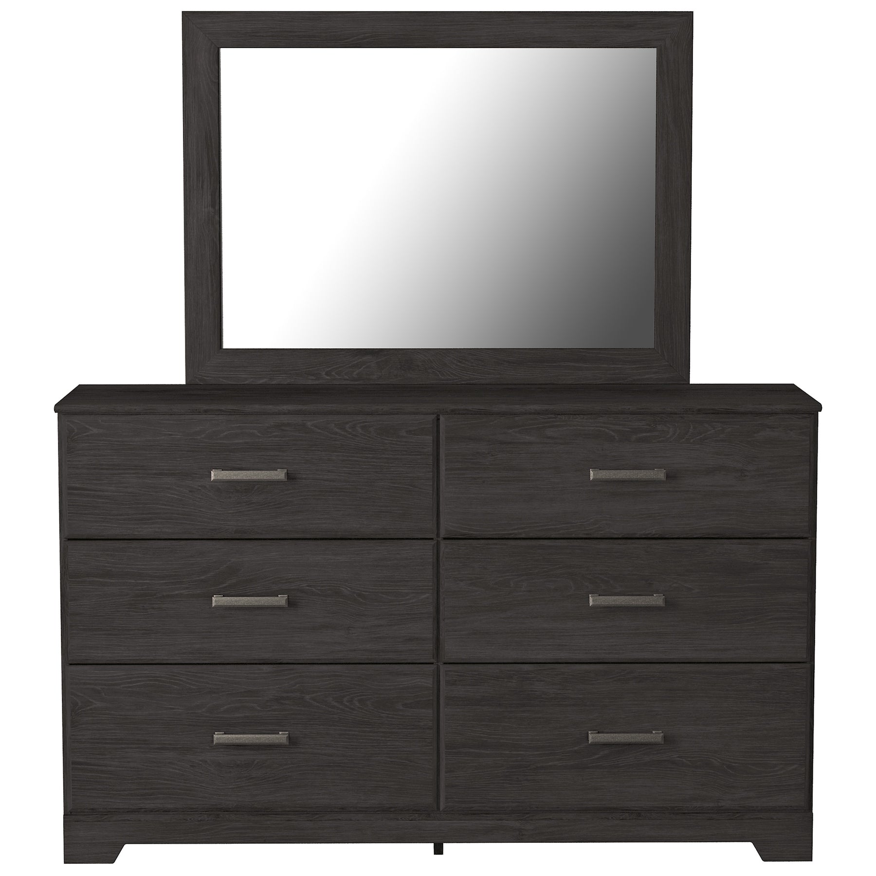 With its clean-lined look and modern attitude, this dresser and mirror is a fresh style awakening. Warm charcoal hue over replicated oak grain easily complements other furniture finishes. Smooth drawer fronts with antiqued pewter-tone handles completes the aesthetic.