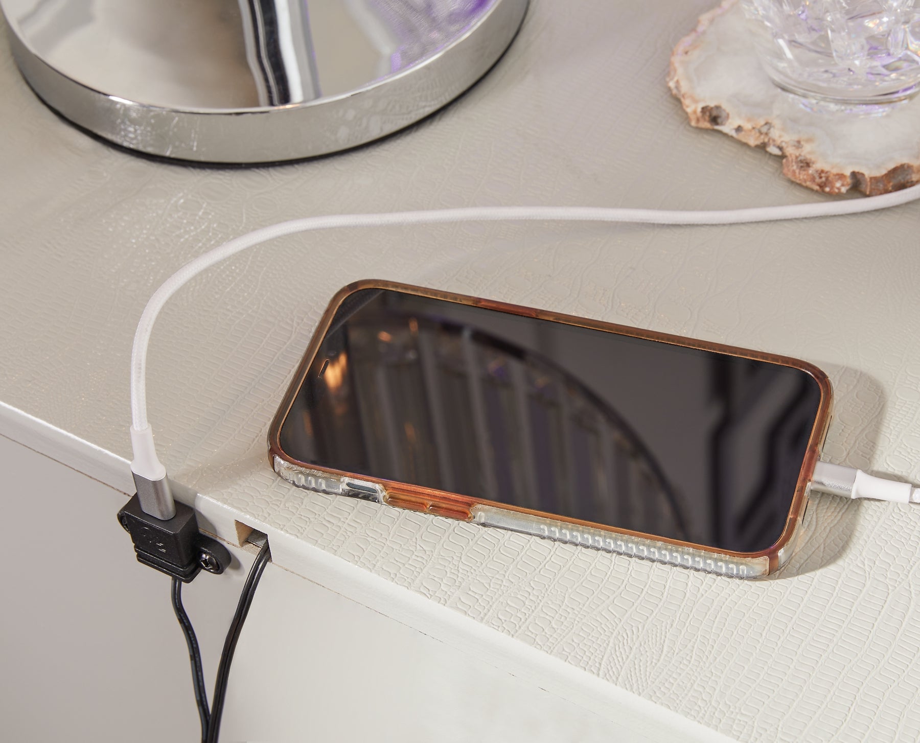 Details Made with engineered wood (MDF/particleboard/plywood) and decorative laminate for the right balance of affordability and durability, Silvertone pearl finished faux gator, Decorative laminate replicates natural or man-made material surfaces with consistent color, pattern and texture, Handles with faux crystal accents, 2 smooth-gliding drawers, Drawer interiors are lined with a faux linen laminate for a clean, finished look, Faceted chrome-tone details, USB and wireless charging options, Power cord included; UL Listed, Minor assembly required