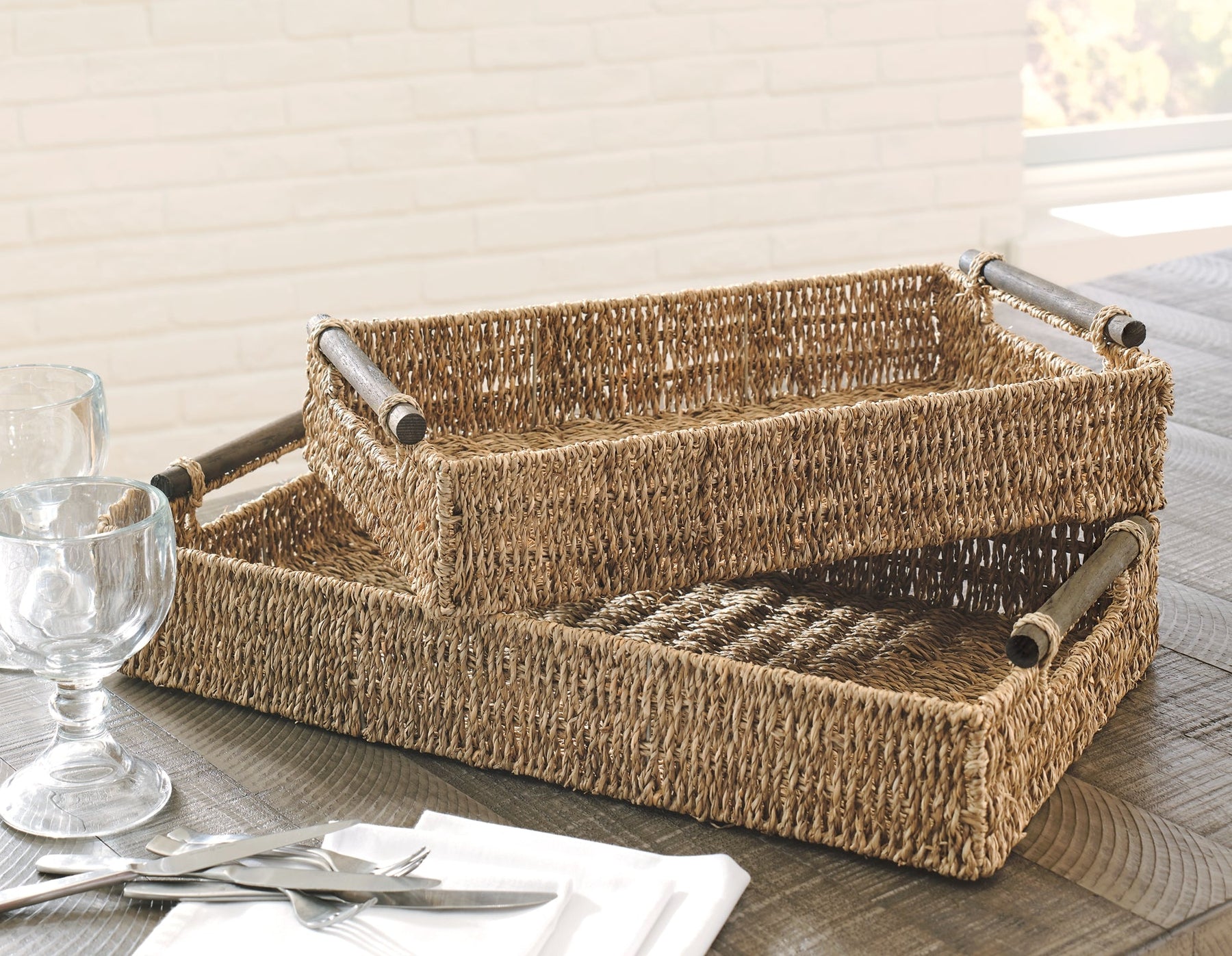 This tray set with cutout wood handles adds a lovely touch of natural appeal to nearly any room. Woven from seagrass in a neutral finish, these lovely trays make a great pick for everything from displaying decorative elements to storing essentials like remotes, game controllers and much more.