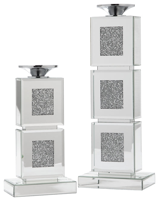 Details Set of 2, Cut-glass mirror with ¼" bevel, Acrylic beads, Silvertone finish, Holds 3" pillar candles (not included)