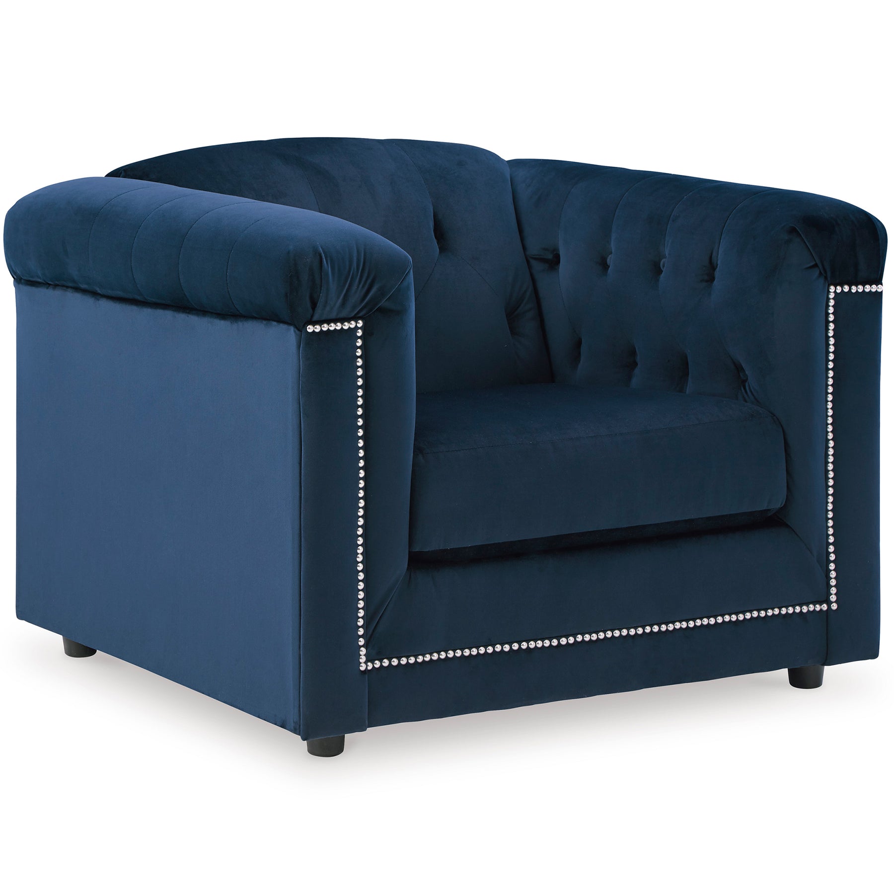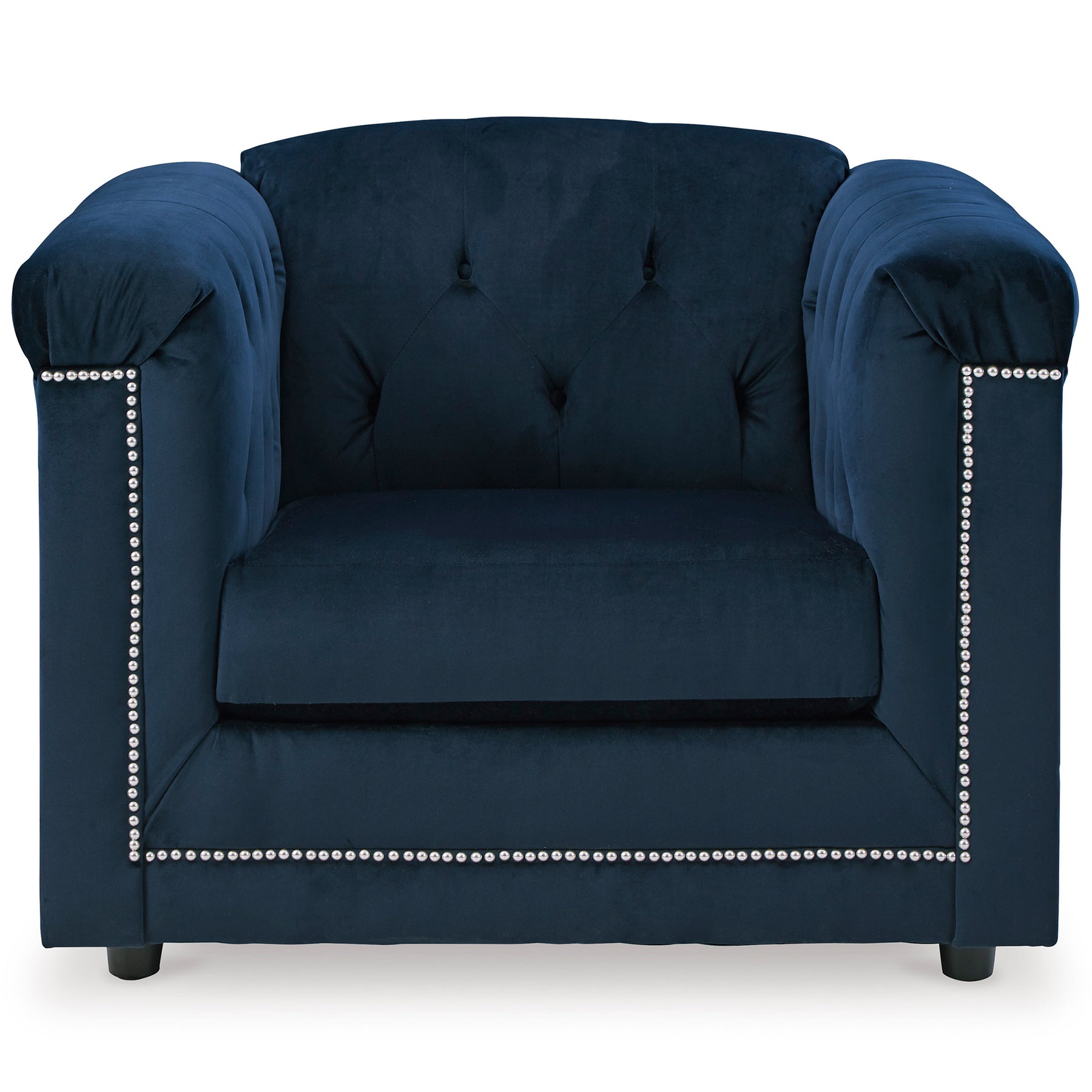 With a timeless classic Chesterfield styling that's very much in vogue, this chair makes a brilliant statement in a beautiful navy velvet fabric that looks as good as it feels. Nailhead trim, button tufting and high shelter arms give the chair an effortlessly elegant appeal. The hidden leg design is an on-trend addition for modern spaces.