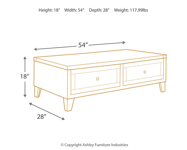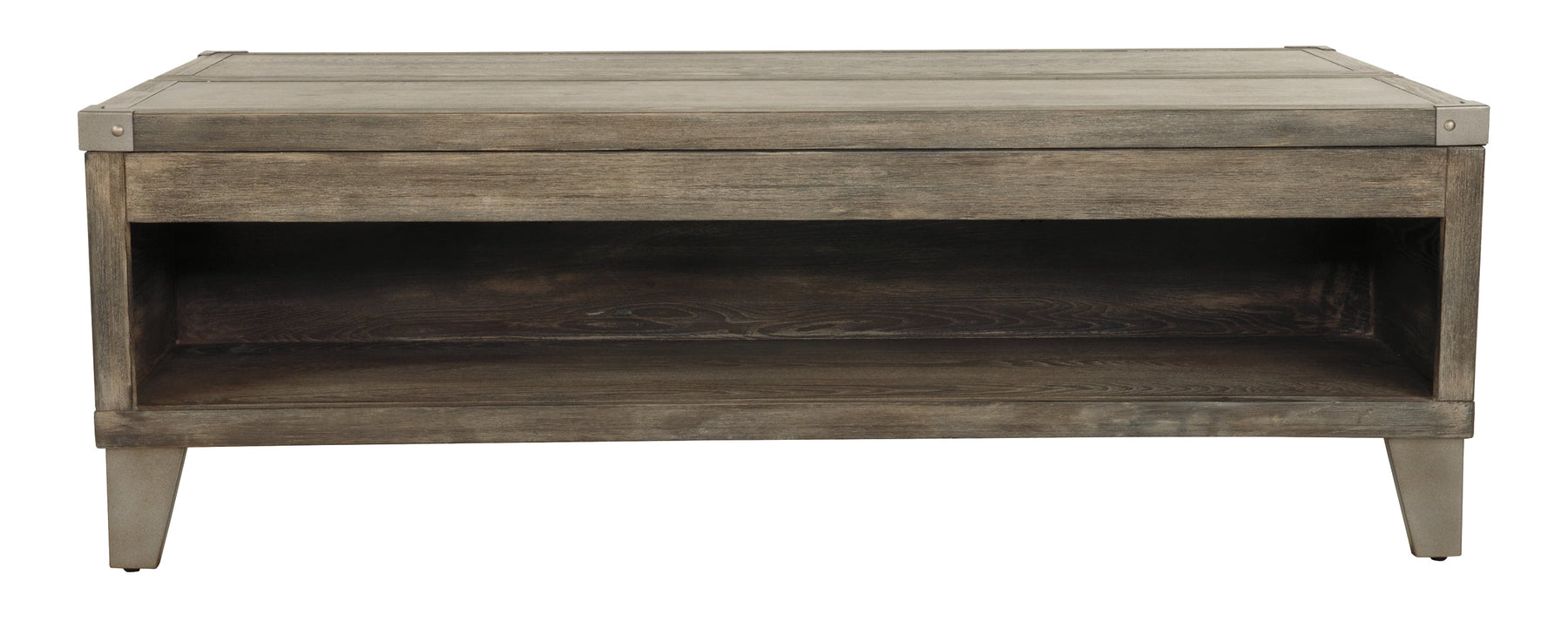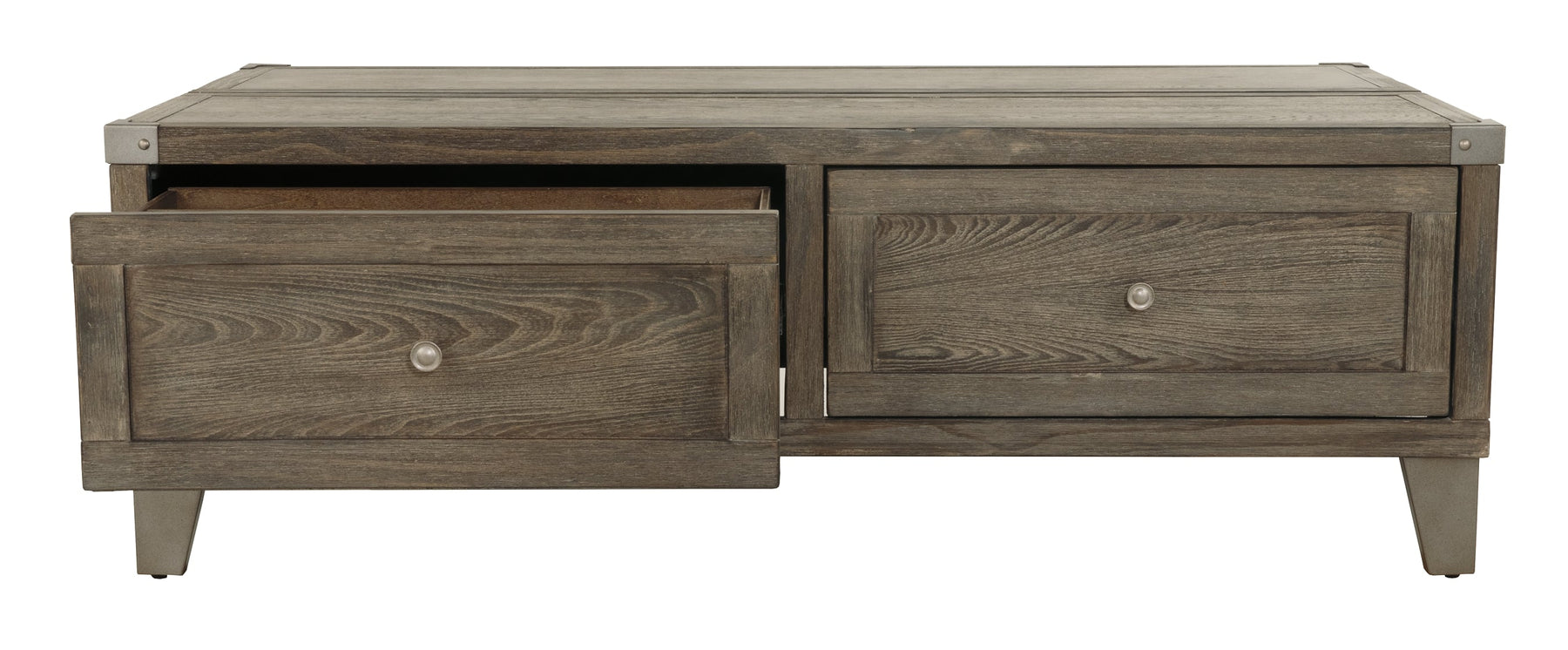 Celebrating the lighter side of modern industrial style, this lift top coffee table is the best in form meets function. The table’s less-is-more weathered finish allows the natural wood grain to take center stage. Metal bracket accents and tapered metal feet in a silvertone finish are a cool yet refined touch. Split top design includes a lift top on one side and fixed surface on the other. Two smooth-gliding drawers offer plenty of handy storage.
