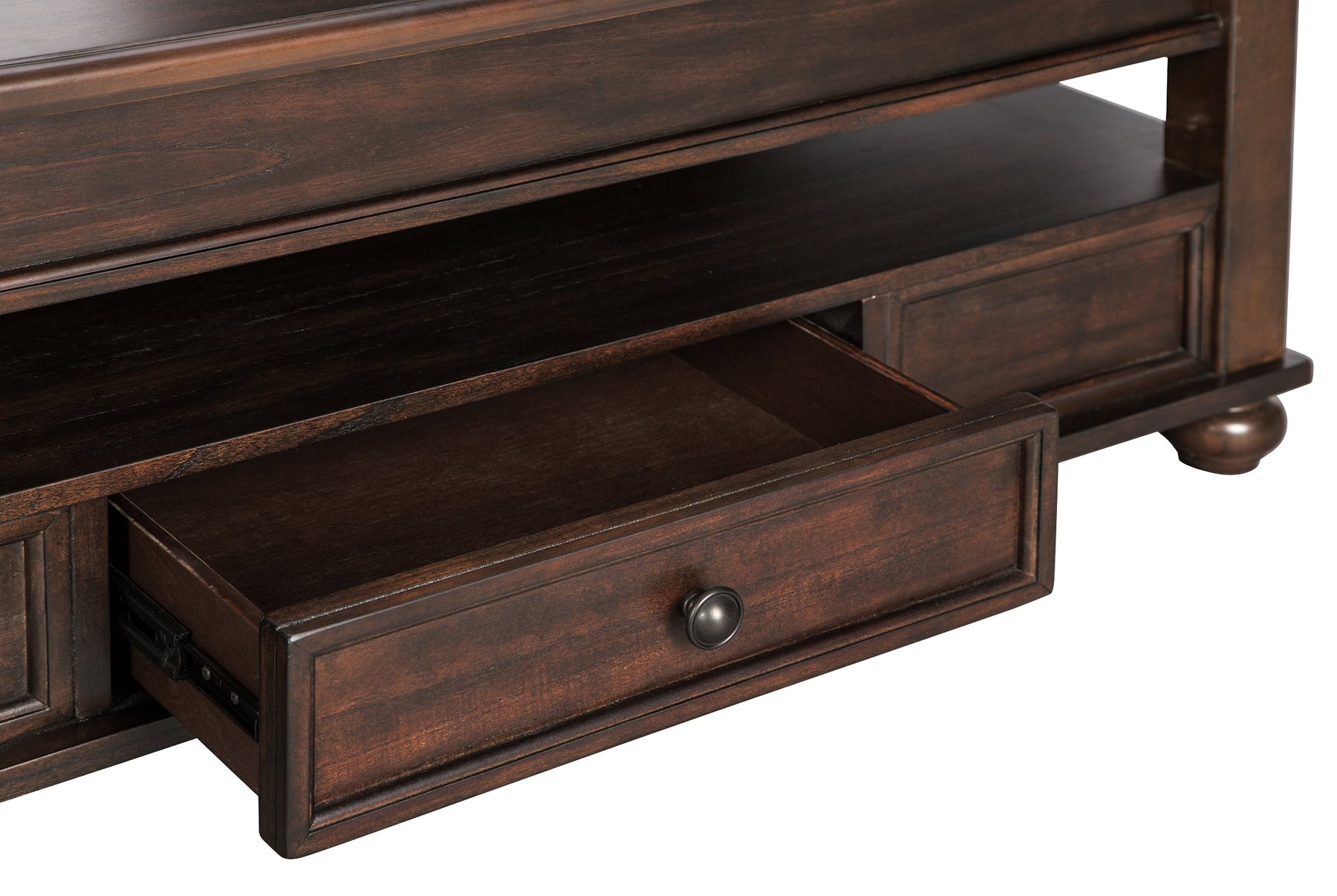 Details Made of veneer, wood and engineered wood, Rich dark brown finish, Bronze-tone hardware, 1 lift top revealing hidden storage, Open middle shelf, 1 storage drawer, Assembly required