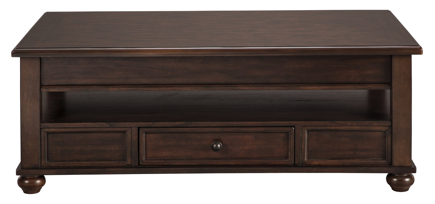 It's all about smart organization and keeping everything easily within reach with this traditional styled lift top coffee table. Its compact design is defined with the open middle shelf, lower drawer and hidden storage compartments found under the lift top. Because the top springs forward, this table can easily be accommodating for dinners in front of the TV or setting up a mobile workspace.