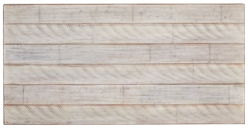 | Details | Includes coffee table and 2 end tables, Made of acacia wood, veneer and engineered wood, Distressed whitewash finish, Decorative metal tension bar and nailhead accents, Assembly required | |