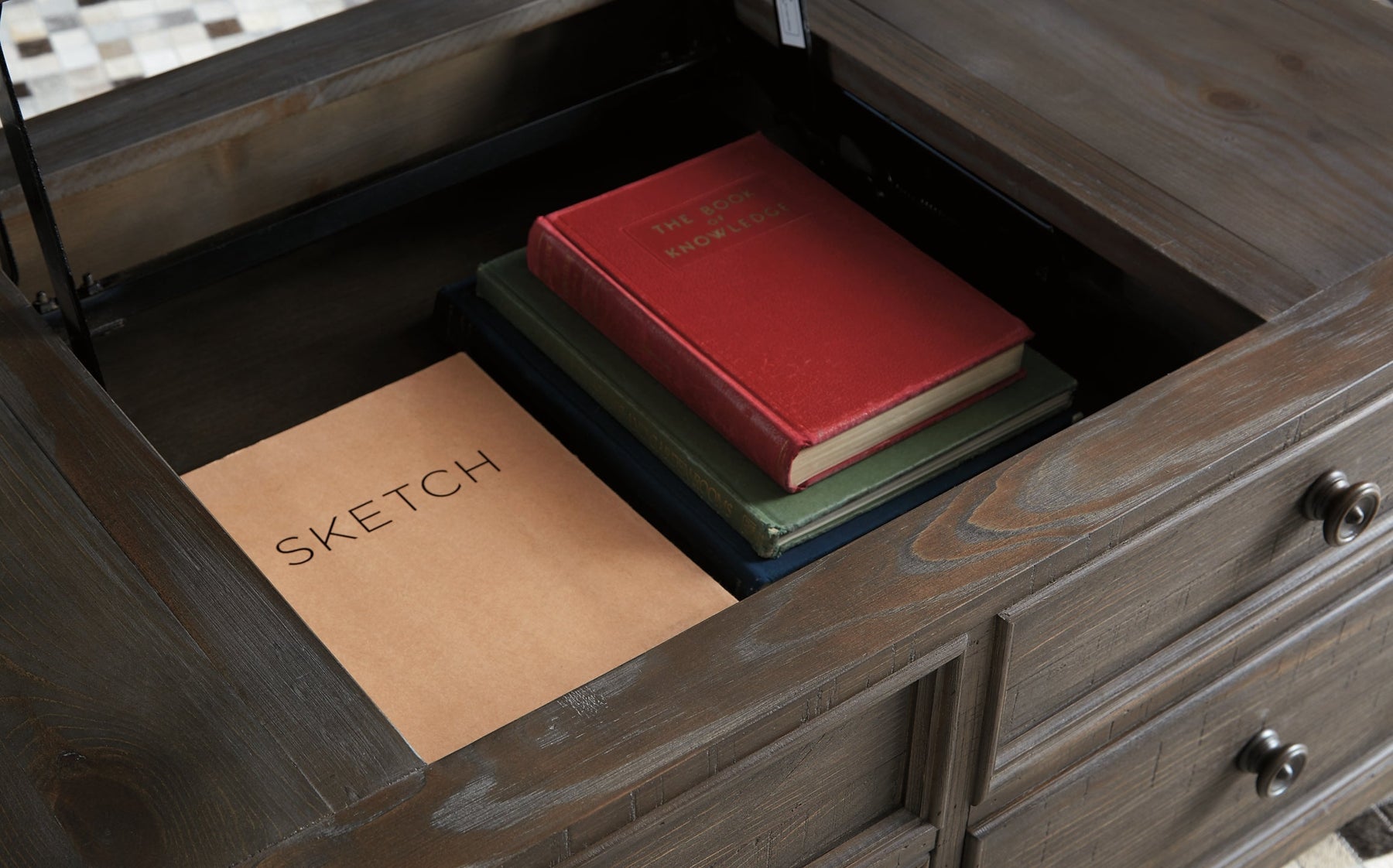 | Details | Includes coffee table and end table, Made of pine wood, veneers and engineered wood, Distressed finish, Coffee table with spring-lift top and 4 smooth-gliding drawers, End table with single display shelf and 1 smooth-gliding drawer, Drawers with dovetail construction, No assembly required | |