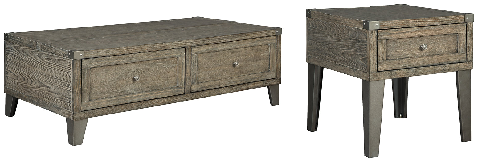 | Details | Includes lift top coffee table and end table, Made of veneers, wood, engineered wood and metal, Weathered finish, Coffee table with split top design (with spring lift on one side) and 2 smooth-gliding drawers, End table with smooth-gliding drawer, Silvertone metal hardware and feet, Assembly required | |