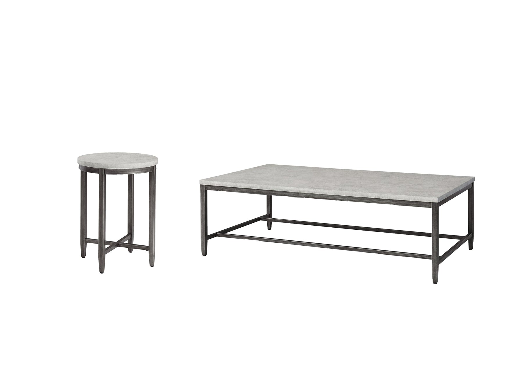 | Details | Includes coffee table and round end table, Faux concrete melamine top, Metal base in dark pewter-tone finish, Assembly required | |