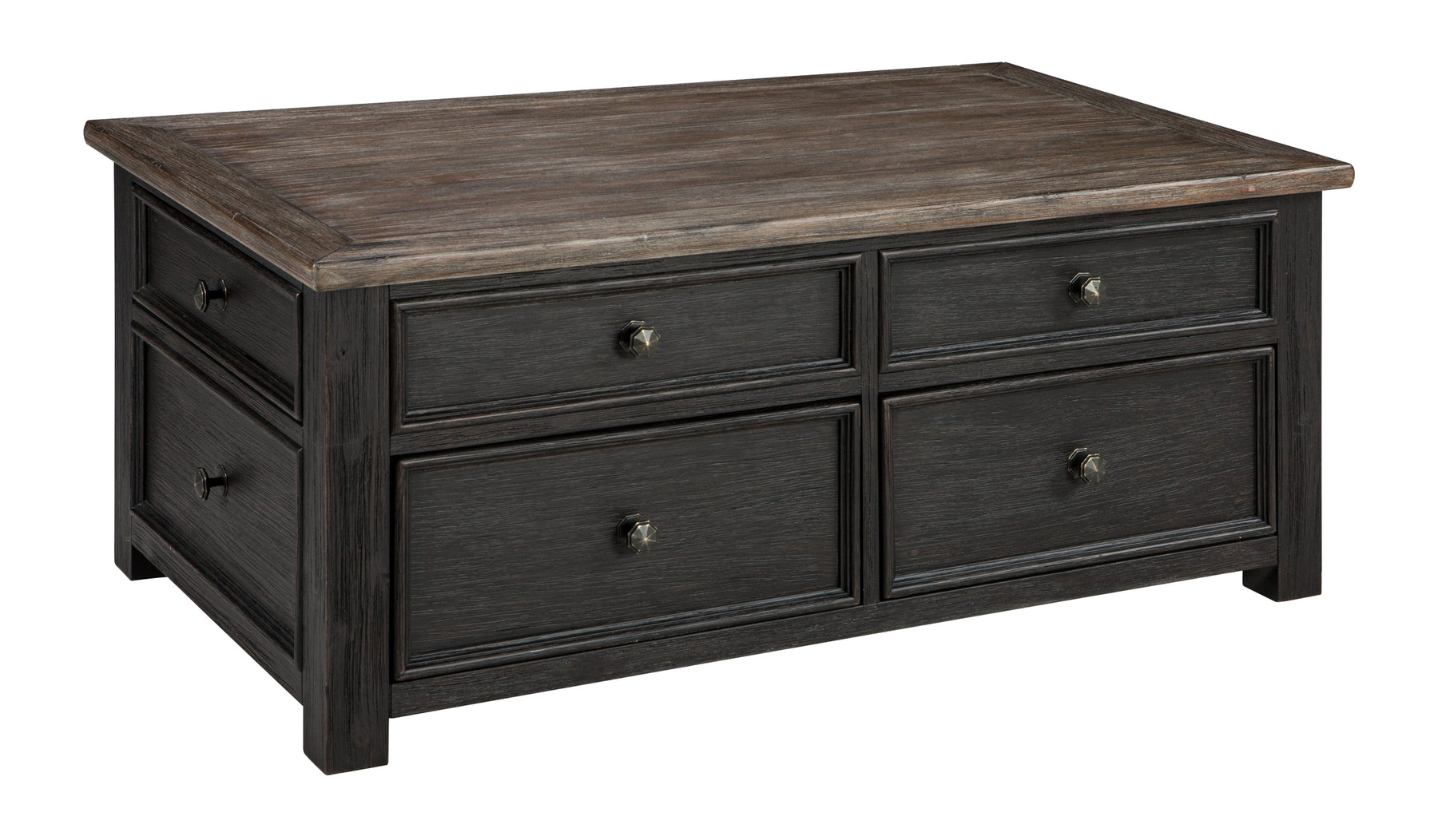 | Details | Includes coffee table with lift top and 2 chairside end tables, Coffee table made of wood, veneer and engineered wood , End table made of wood, white oak veneer and engineered wood with plank-styled top, Weathered grayish brown top, Textured wire-brushed base in a black rub-through finish, Dark bronze-tone hardware, Coffee table features smooth-gliding drawers; casters for easy mobility, End table features single smooth-gliding drawer and lower shelf , End table includes an integrated 110V power supply with dual USB charging port, Power cord included; UL Listed, Coffee table arrives assembled, End table requires assembly | |