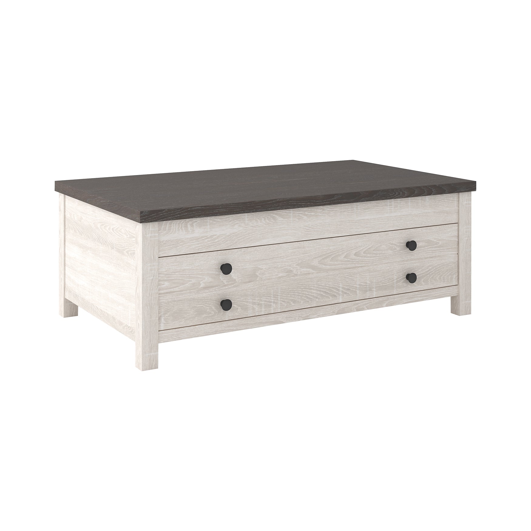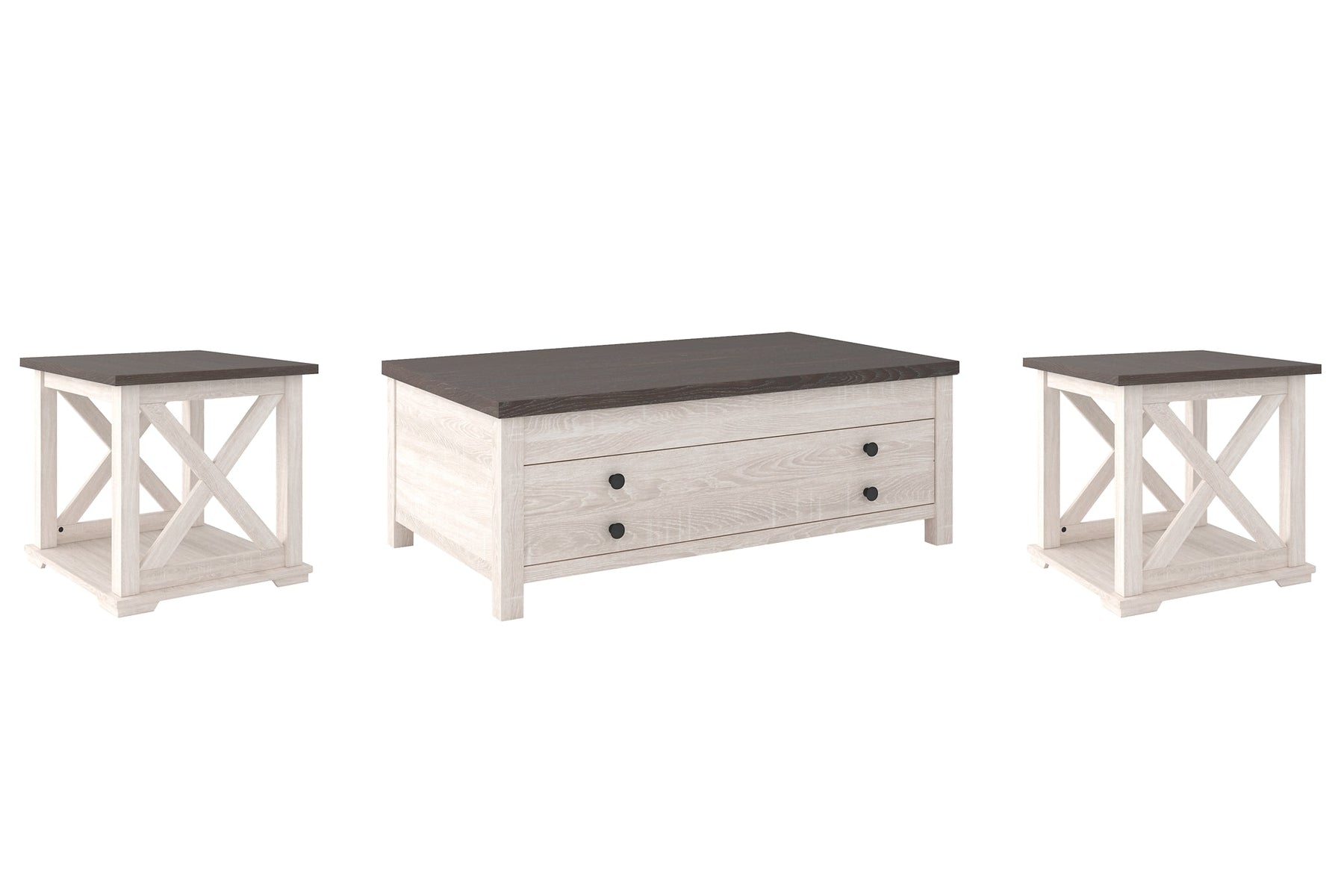 Details Includes coffee table and 2 end tables, Made of decorative laminate over engineered wood with two-tone, gray and antiqued white color scheme, Coffee table with sliding door, shelved storage and casters for easy mobility, Assembly required