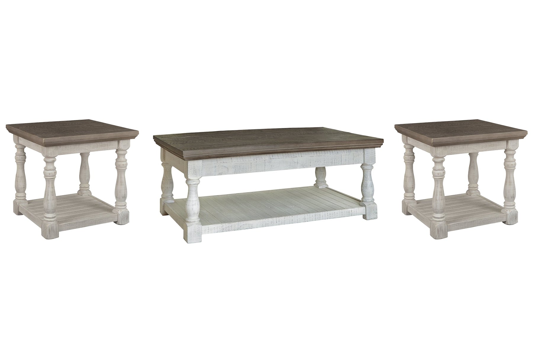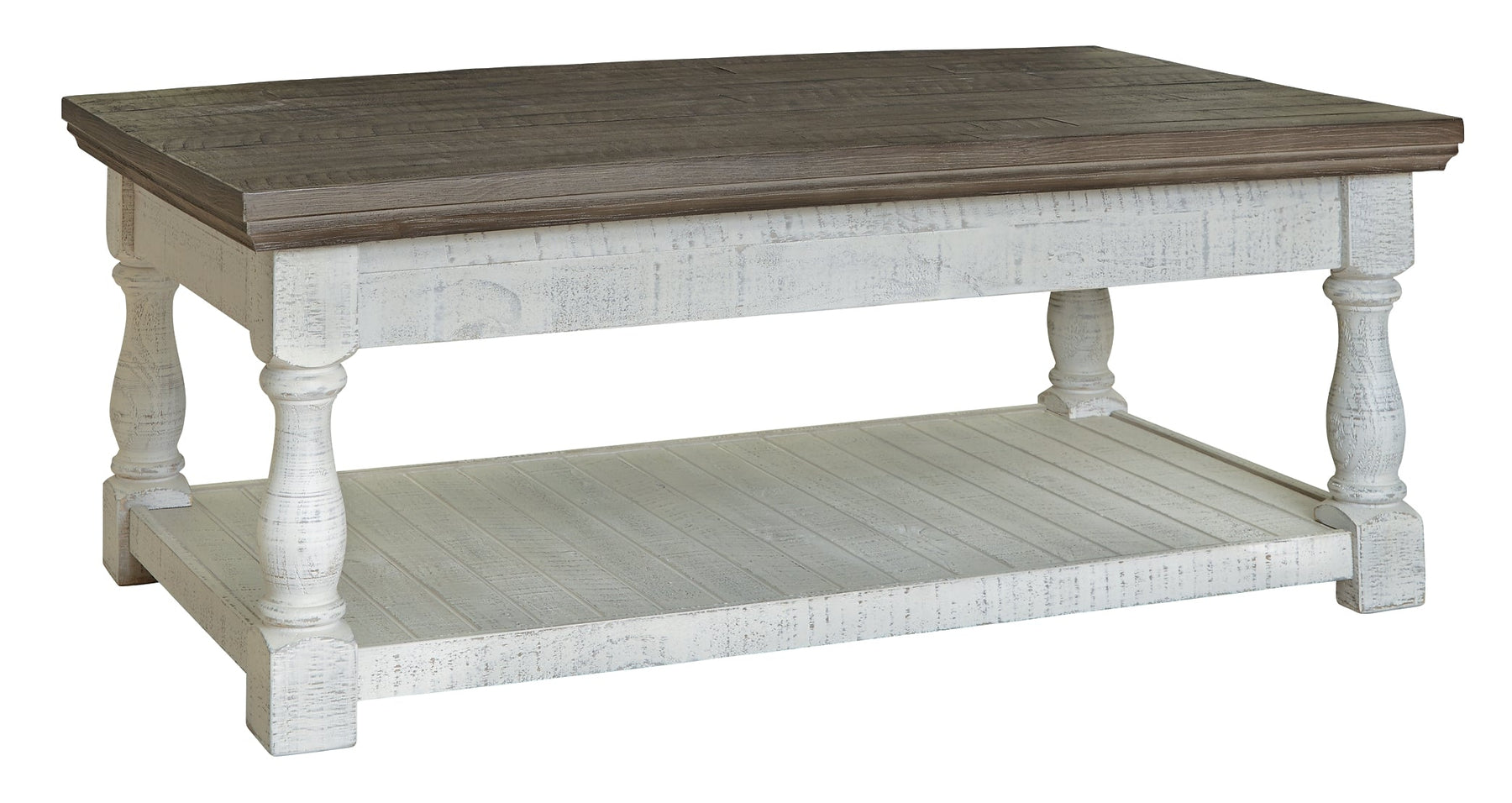 Details Includes lift top coffee table and 2 end tables, Made of pine wood, pine veneer and engineered wood, Two-tone distressed finish: weathered gray top; vintage white base, Coffee table with spring-lift top and 2 hidden storage trays, Assembly required