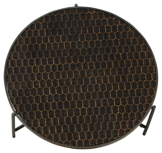 Play up your contemporary cool character with this coffee table. The scooped honeycomb design on the top recalls retro motifs for a modern era, with a distressed brown finish enhancing the pattern. A round tubular base with a gray glaze rounds out the look. This table glows with a refined kind of radiance.