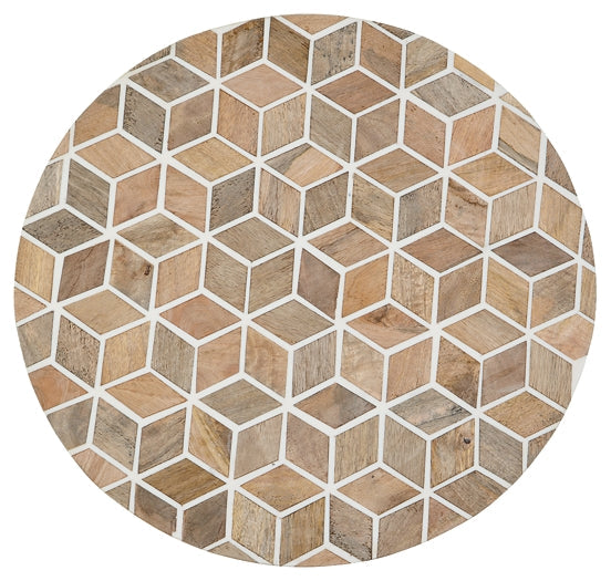 Ground your space with the geometric appeal of this accent table. Both a dynamic decorative accent and a functional surface, the eye-catching design on top is created by combining wood and a white resin inlay. Hairpin legs are a mod touch.