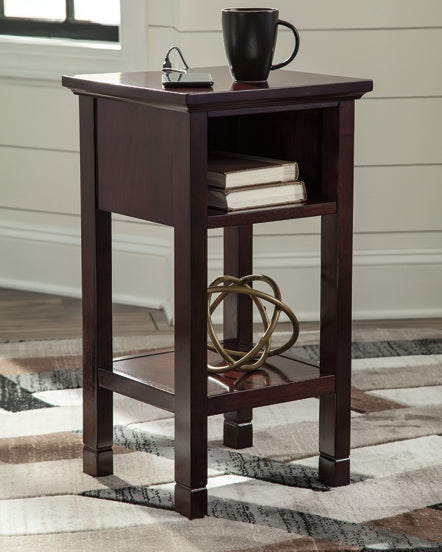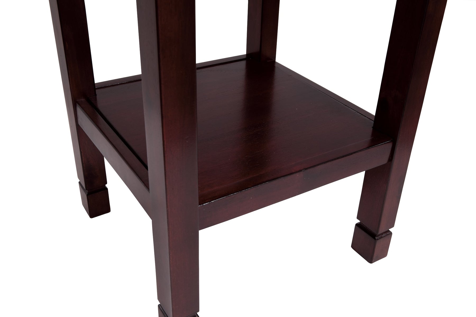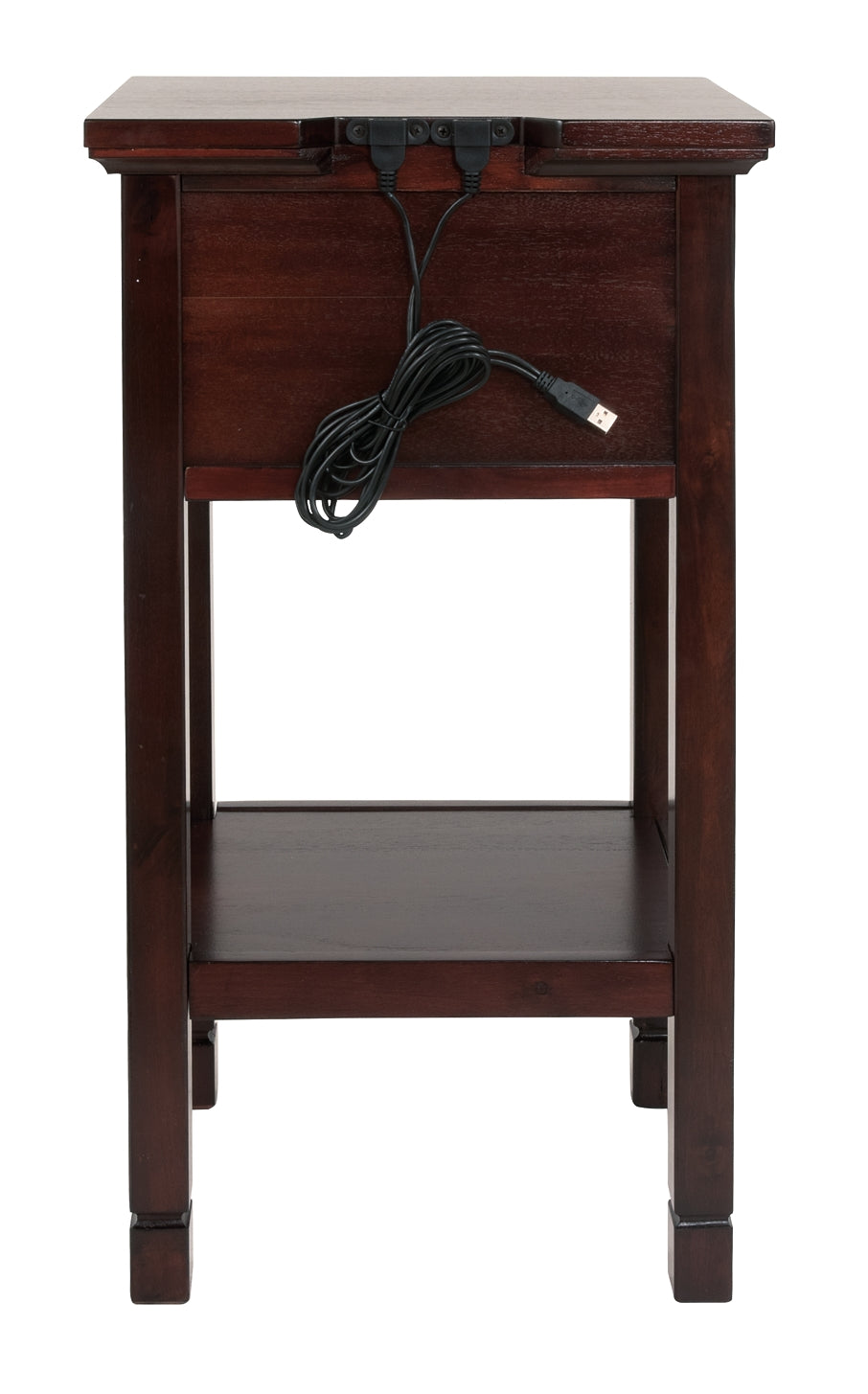 | Details | Made of wood, engineered wood and veneers, Cherry brown finish, 1 open cubby and bottom shelf, 2 USB charging ports, Power cord included; UL Listed | |