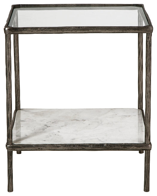 | Details | Made with sand casted aluminum, Antiqued brass-tone finish, Clear glass tabletop, White marble lower shelf, Assembly required | |