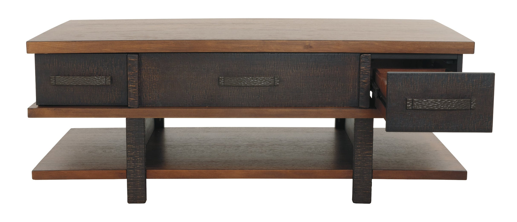 | Details | Made of veneers, wood and engineered wood, Two-tone treatment, Heavily textured distressing, 2 smooth-gliding drawers, Hammered-style metal pull, Lift-top design with storage underneath, Assembly required | |