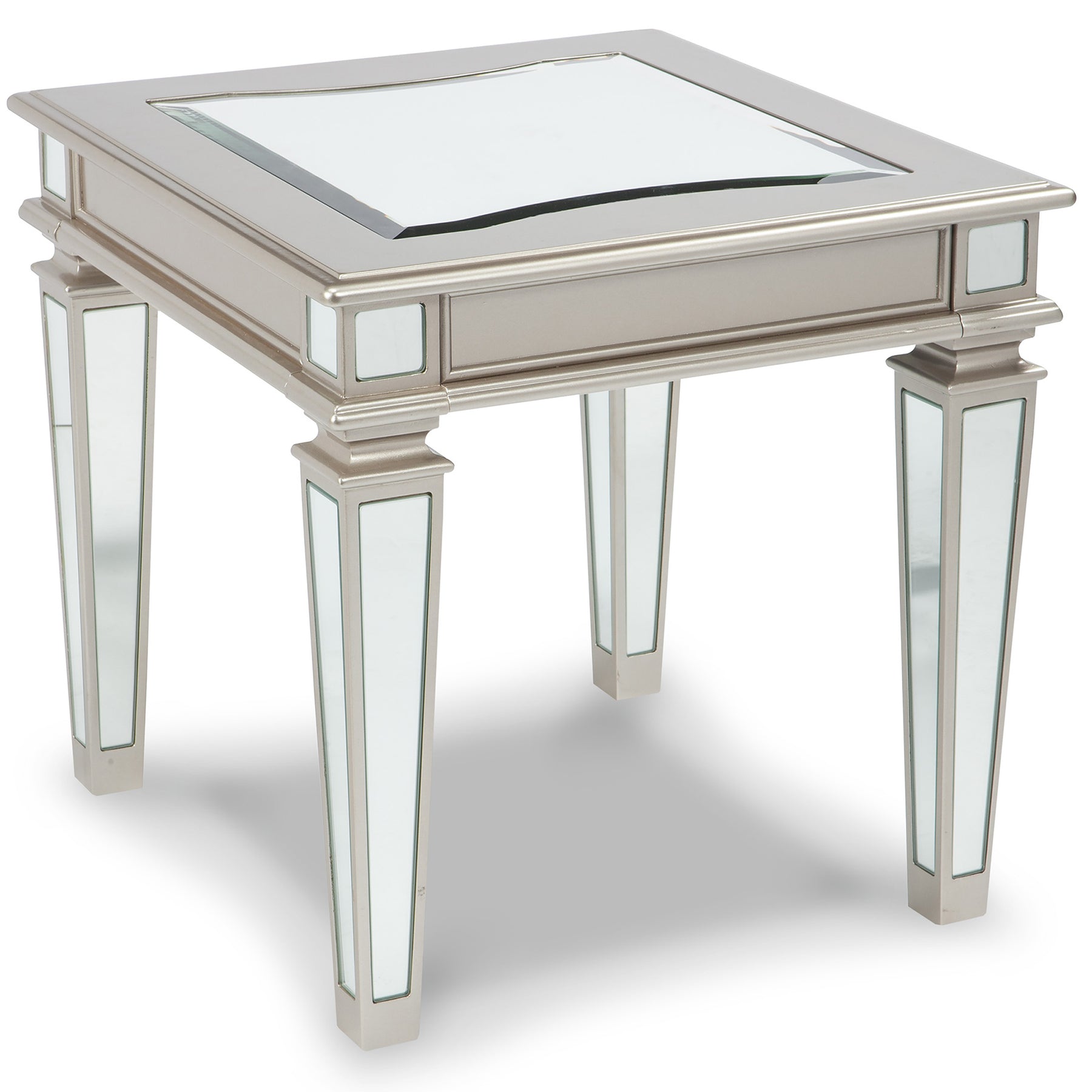 With glitz and glam worthy of a queen, this end table is ravishing. Tabletop is adorned with a slightly curved mirrored beveled glass inset. Apron panels marry in alluring mirrored legs. With its silver sheen finish, this table will make you feel like royalty.