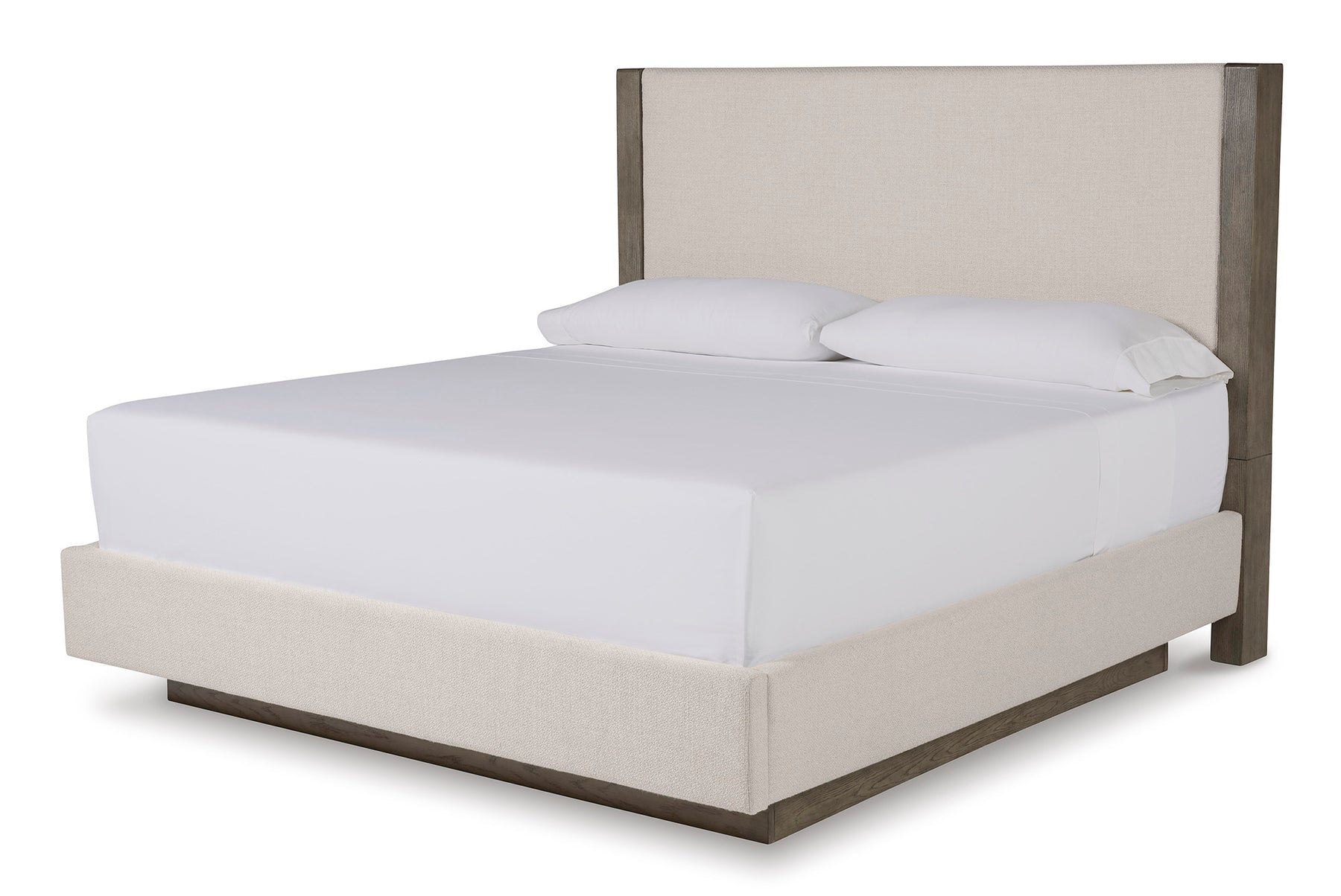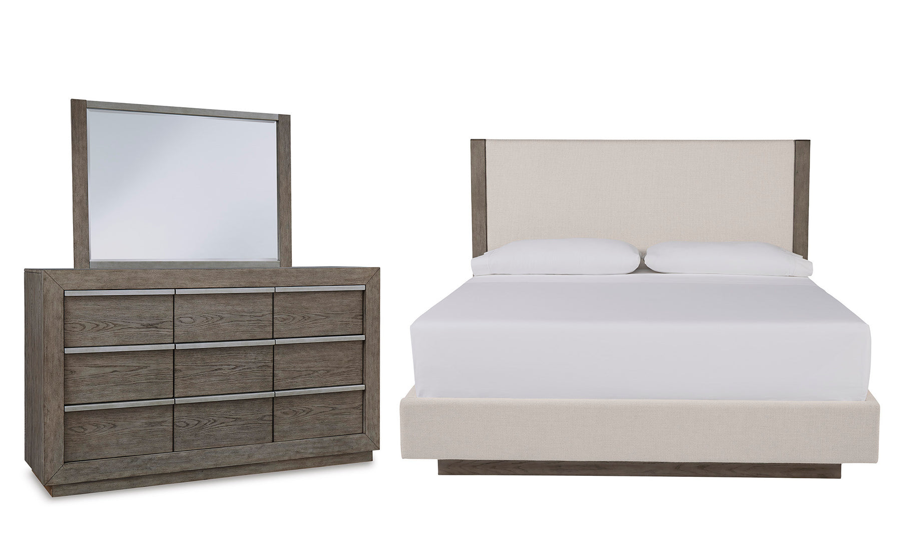 Anibecca Queen Upholstered Panel Bed with Mirrored Dresser