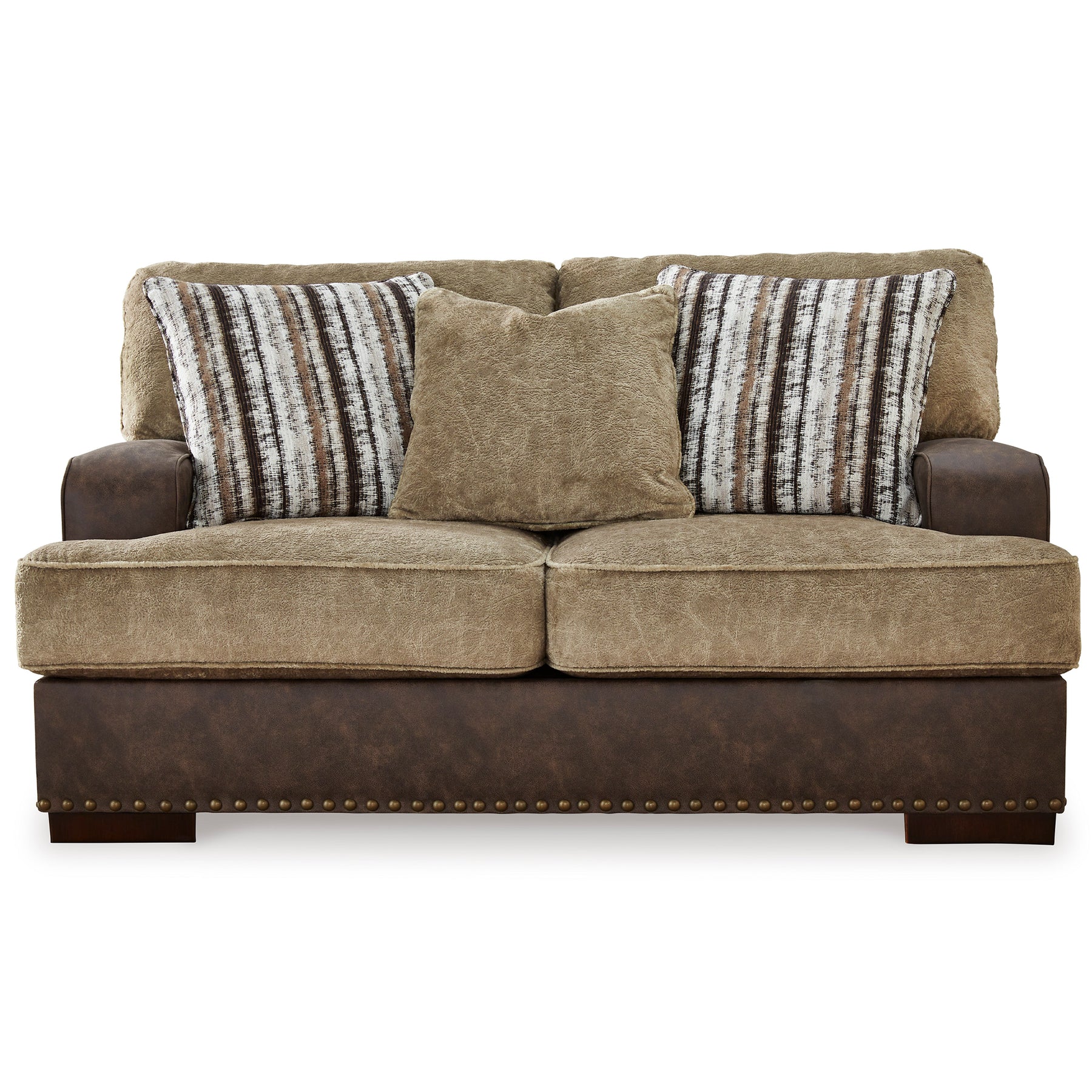| Details | Corner-blocked frame, Loose seat and back cushions, High-resiliency foam cushions wrapped in thick poly fiber, Brown polyester interior upholstery and deep brown polyester/polyurethane exterior upholstery, Throw pillows included, Pillows with feather-fiber fill, Bronze-tone nailhead trim, Platform foundation system resists sagging 3x better than spring system after 20,000 testing cycles by providing more even support, Smooth platform foundation maintains tight, wrinkle-free look without dips or sags that can occur over time with sinuous spring foundations | |