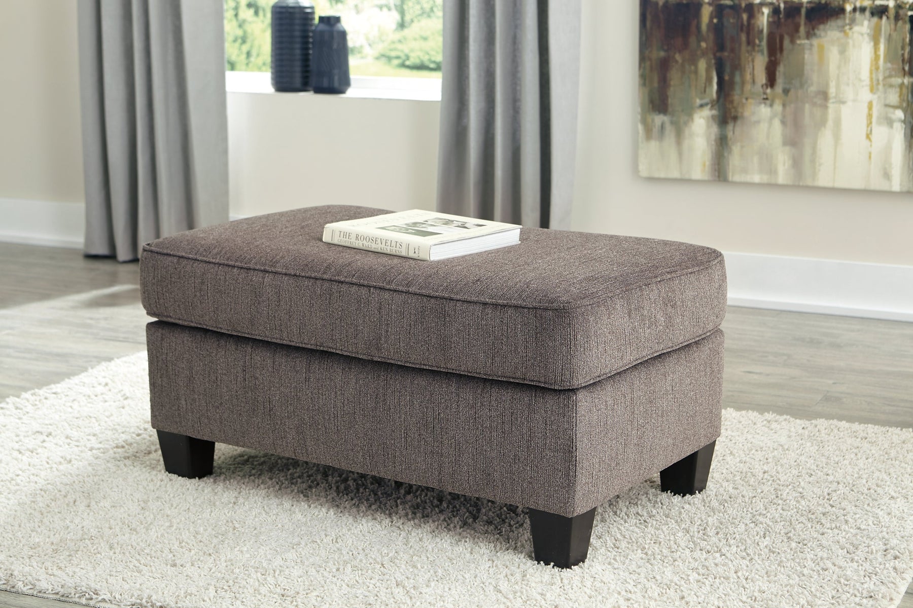 This ottoman is the perfect addition for setting a modern scene full of casual flair. In the on-trend slate color, its textured chenille with solid microfiber upholstery provides a luxuriously soft feel that’s inviting; especially for kicking up your heels to relax.
