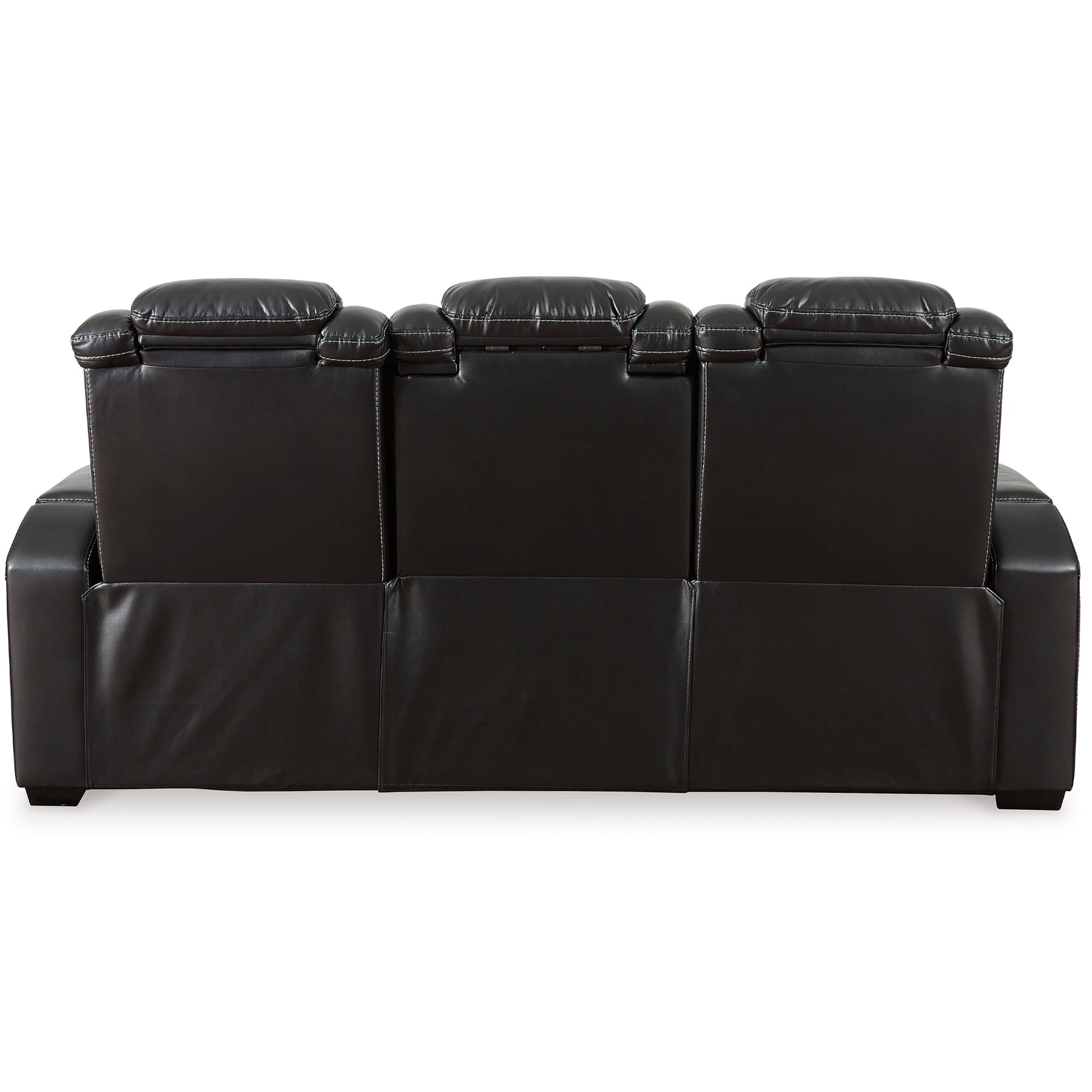 Details Dual-sided recliner, Polyester/polyurethane upholstery, Corner-blocked frame with metal reinforced seats, Attached backs and seat cushions, High-resiliency foam cushions wrapped in thick poly fiber, One-touch power controls with adjustable positions, Easy View™ power adjustable headrests, LED lighted cup holders; flip up padded armrests with hidden storage underneath, Drop down table with 2 cup holders and a handy docking station for charging electronics, Includes USB charging port in each power control, Flip up LED light (under center seat headrest), Underneath LED lighting, Power cord included; UL Listed