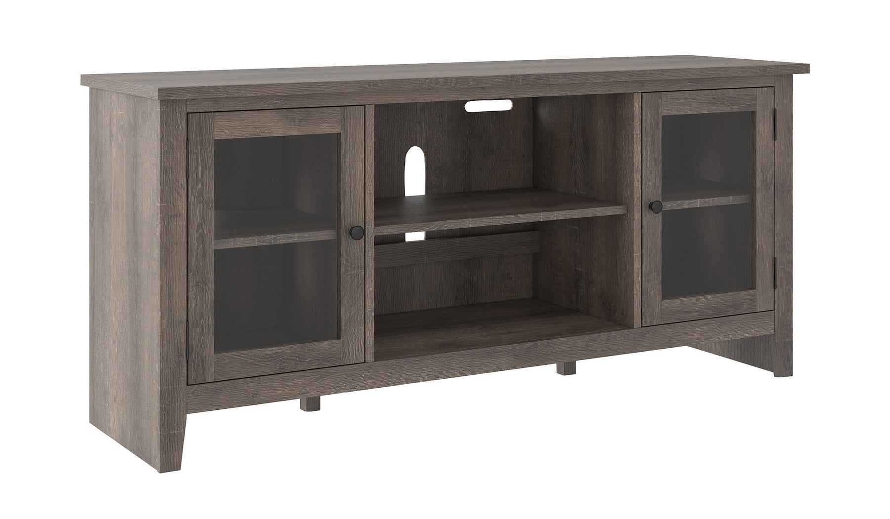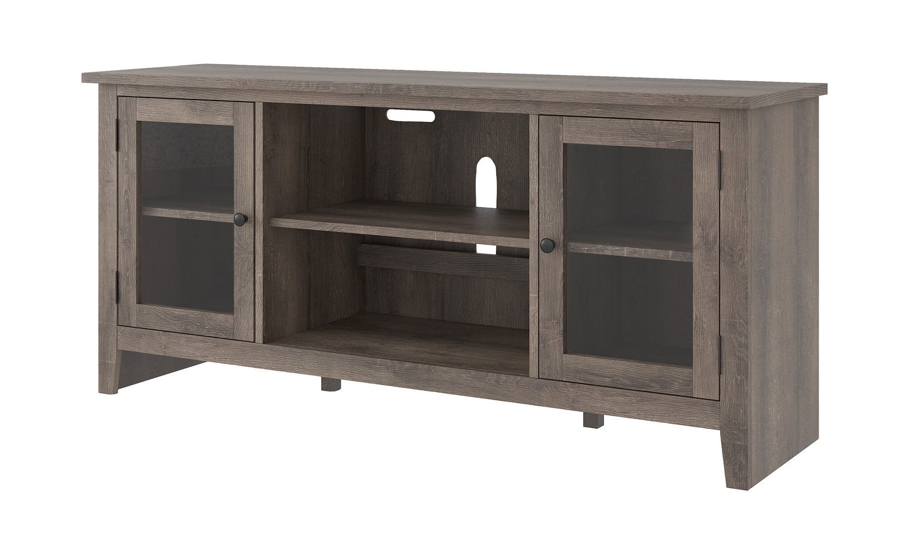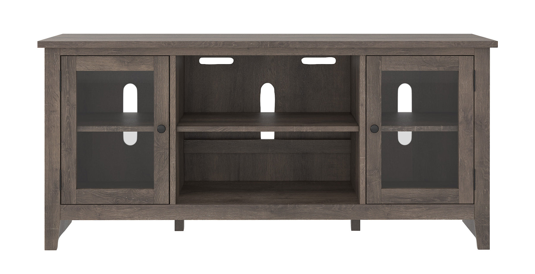 | Details | Includes TV stand and electric fireplace insert (W100-02), Made of decorative laminate and engineered wood, Replicated weathered oak; gray finish, Pair of glass inset doors, Adjustable center shelf; 2 side shelves and cutouts for wire management, Fireplace provides up to 4608 BTU/1400W, warms up to 400 square feet (heats a mid-size room) and includes:, 6-level temperature setting; 5 levels of flame brightness, LED-lit flame operating with or without heat, Option of faux glass crystals or stones , Overheating control device, Remote control with LED display, UL Listed; power cord included, Assembly required | |
