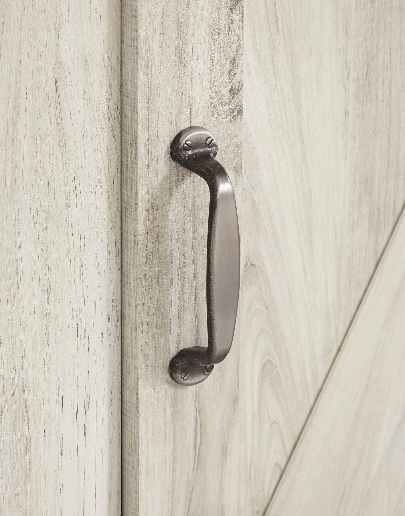 Express your modern farmhouse style, this TV stand with infrared fireplace insert is right in tune with your relaxed approach to high style. Its wispy white finish over replicated oak grain is a delightful change from the ordinary. Clean-lined, classic styling with barn door inspiration provides a country-chic aesthetic that’s a breath of fresh air.