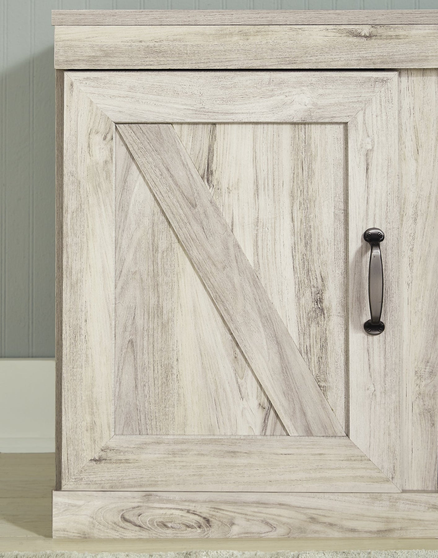 Details Made of engineered wood (MDF/particleboard) and decorative laminate, Wispy white finish over replicated oak grain with authentic touch, One open storage area and 2 single-door storage areas (each with adjustable/removable shelf), Cutouts for wire management and ventilation, Compatible with W100-02 and W100-101 LED fireplace inserts (sold separately), Assembly required