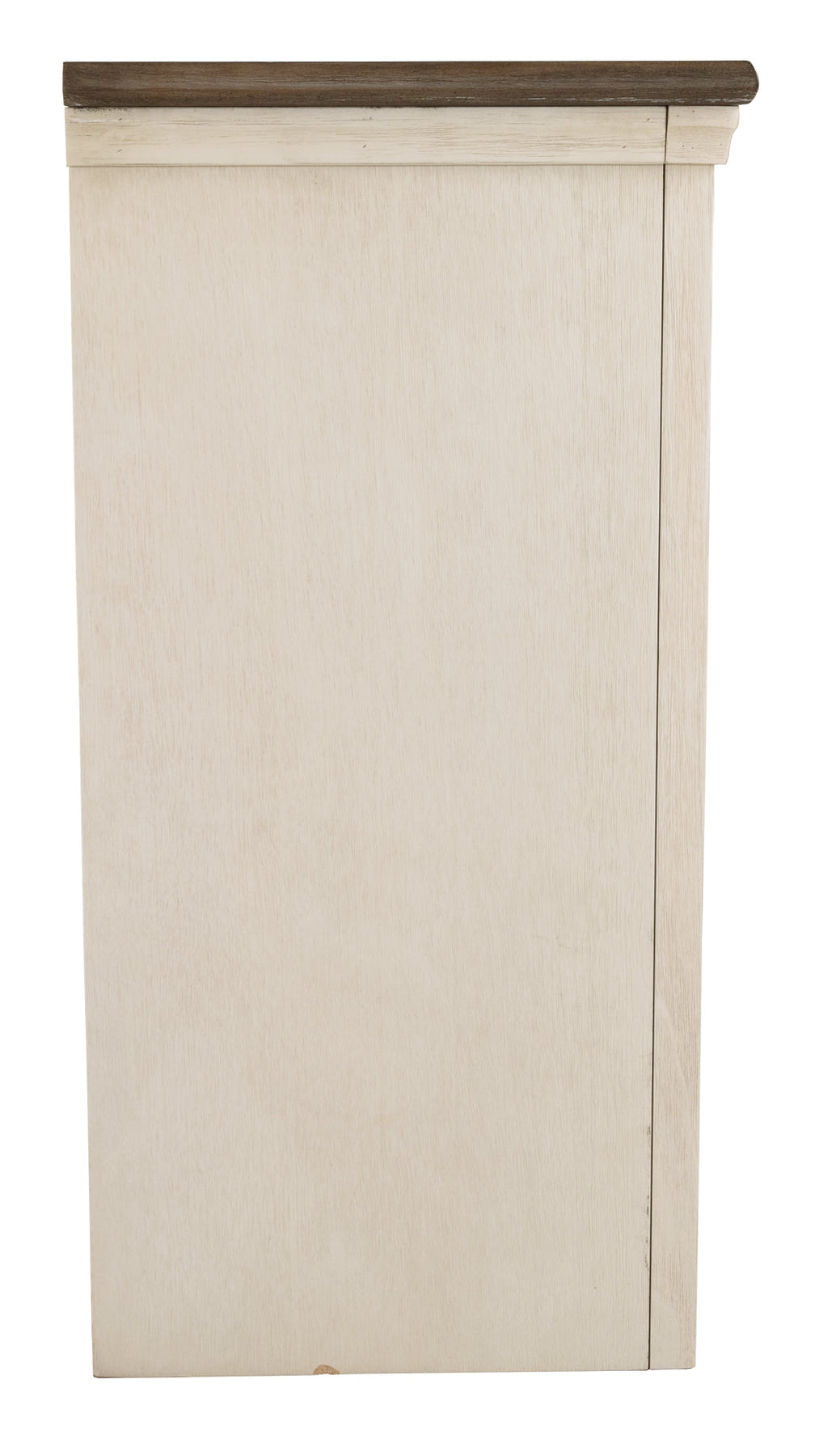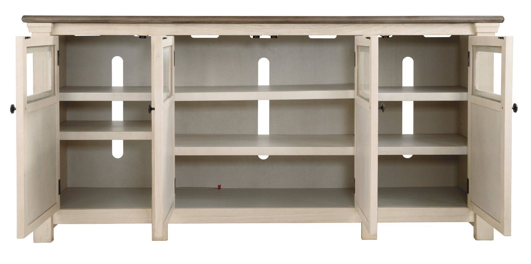 Whether your style is farmhouse fresh, shabby chic or country cottage, you’ll find this extra large TV stand perfectly in tune. Its two-tone, gently distressed finish pairs weathered oak with antique white for that much more quaint character. Charming elements include crossbuck adorned cabinets with glass inlays for peek-through flair. Ample adjustable shelving and cutouts for wire management nicely accommodate your media needs.