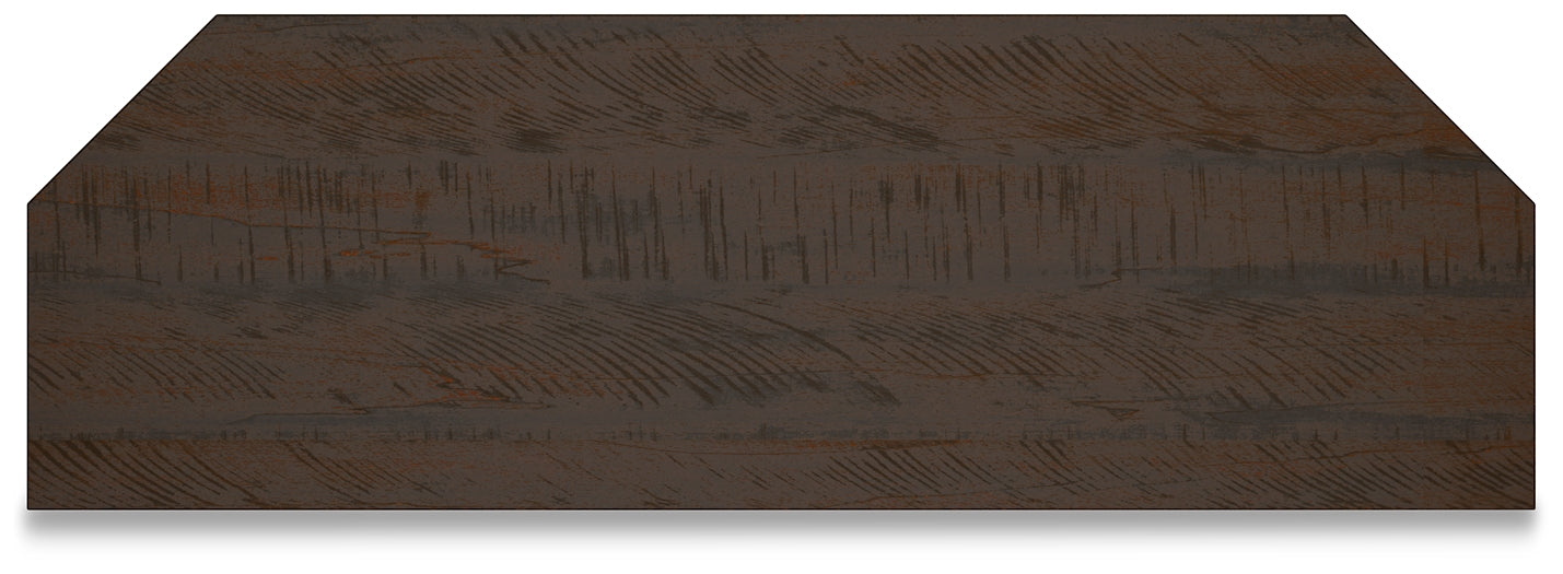 Details Made with engineered wood and decorative paper laminate, Replicated burnt umber rustic wood grain, 2 shelves, Cutouts for wire management, Assembly required