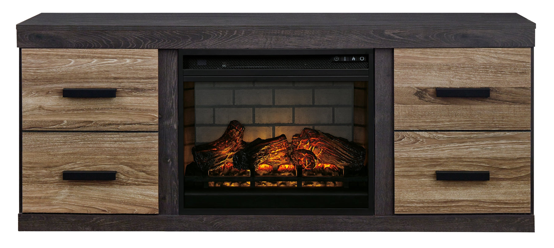 | Details | Includes TV stand and electric fireplace insert (W100-101), Made with engineered wood (PDF/particleboard) and decorative laminate, Warm gray vintage finish with a white wax effect; vintage aged black/brown finish over replicated oak grain, Matte black hardware, TV stand with removable center shelf and 2 cabinets, each with single-shelf storage, Cutouts for wire management and venting for heat, Fireplace provides up to 5386 BTU/1500W and warms up to 1,000 square feet (heats larger rooms), 7-level temperature setting, multi flame system, 5 brightness levels and LED glowing embers effect, LED flame operates with or without infrared heat, Remote control with LED display, Programmable timer will turn off the unit after a set period of time, UL Listed; power cord included, Assembly required | |
