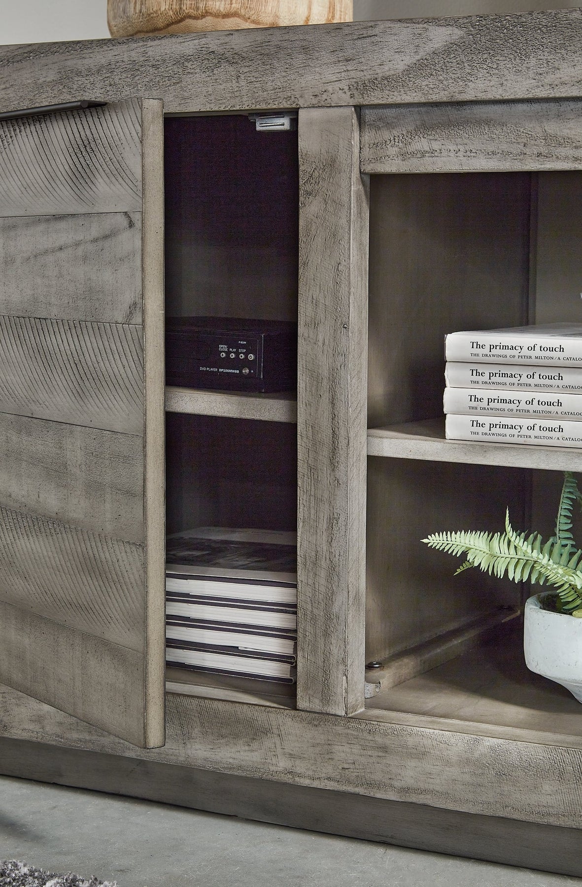 Details Made of pine wood, pine veneer and engineered wood, Weathered light gray finish, 2 side cabinets each with single adjustable shelf, Fixed open center shelf, 3 open cubbies, Cutouts for wire management, Power cord included; UL Listed, Assembly required