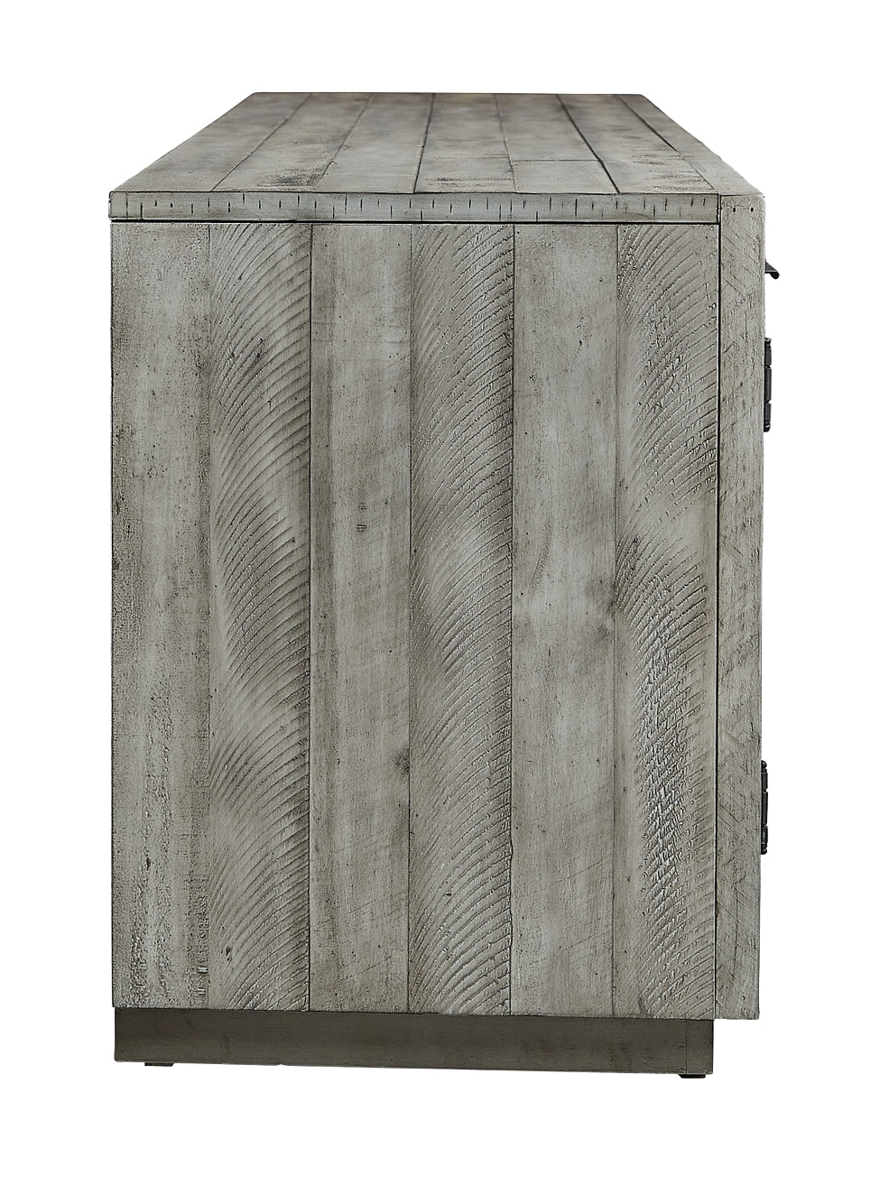 Balancing chic flair with a relaxed sensibility, this extra-large TV stand strikes just the right tone for rustic sophistication. Beautifully clean lines are subtly enhanced with relaxed distressing and saw marks for authentic barn wood character. You're sure to love the convenient open style for easy access to media equipment and accommodating pretty home accents.