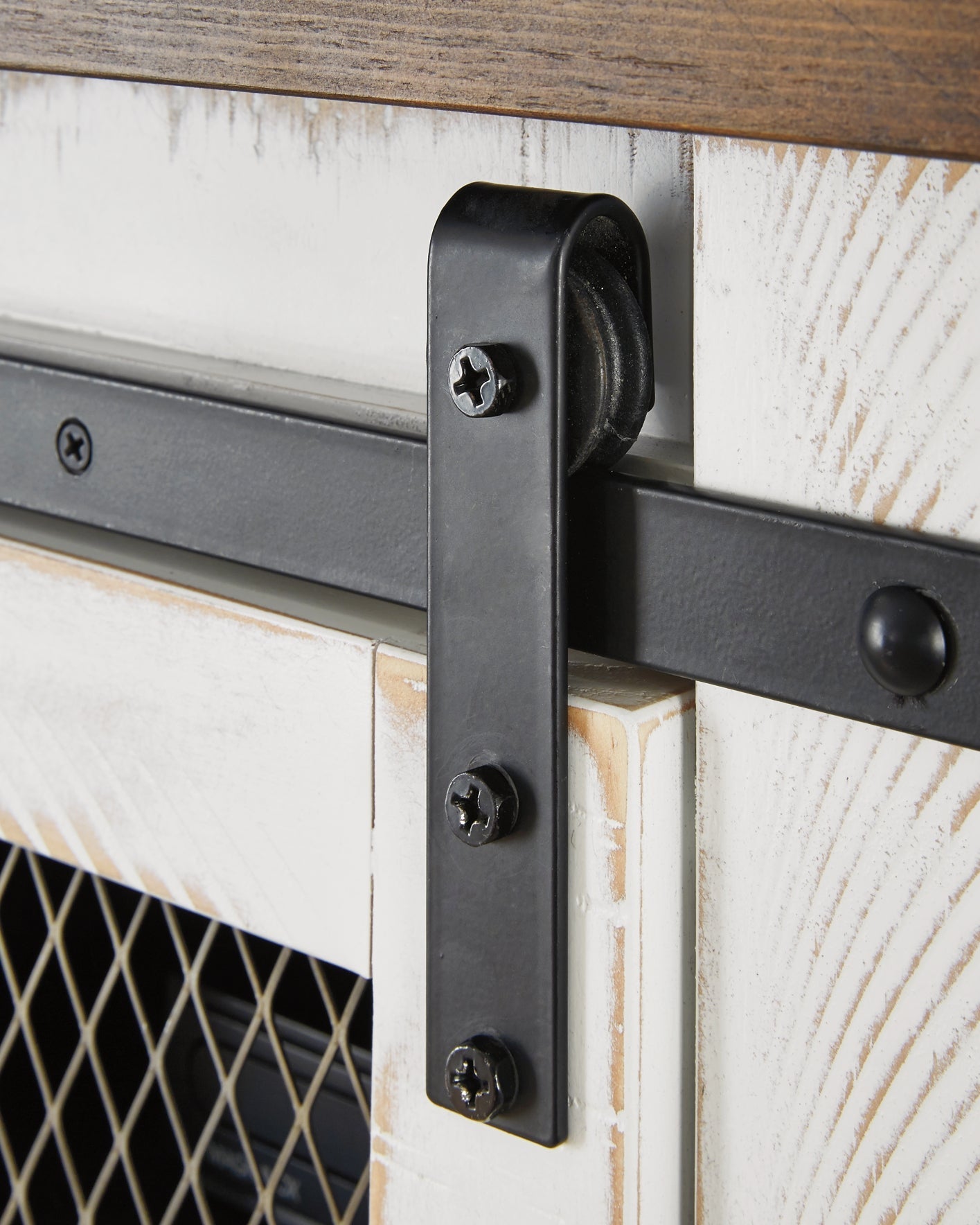 Details Made of pine wood, veneers and engineered wood, Distressed finish; vintage white and aged natural pine color, 2 sliding barn doors with inset wire mesh, 4 side shelves, 2 center shelves, Dark antiqued gray hardware, Cutouts for ventilation and wire management, Assembly required