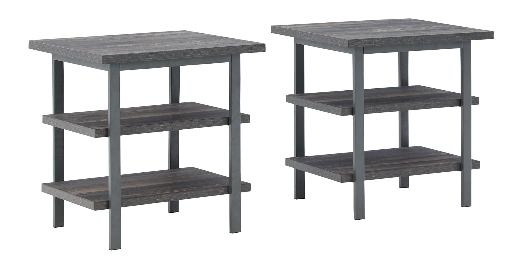 Details Includes 2 matching end tables, Made of engineered wood with laminate, Metal frame with gunmetal finish, 2 display shelves, Assembly required