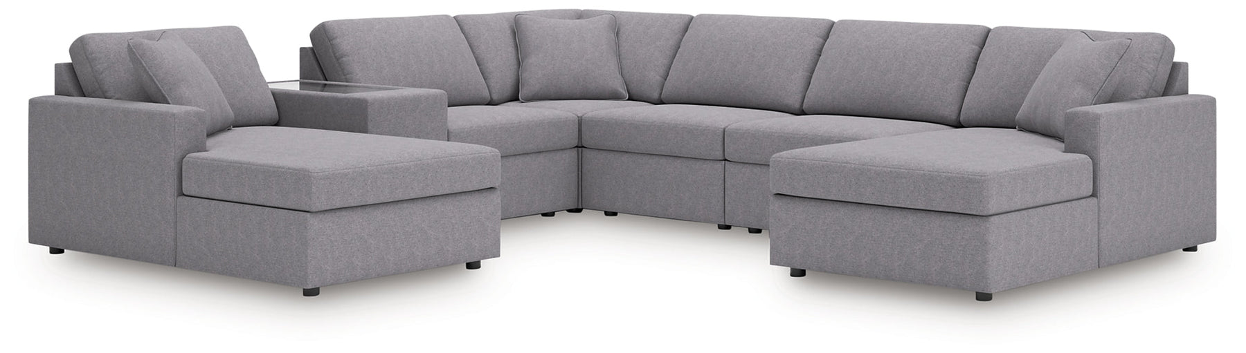 Includes 7 modular pieces: left-arm facing corner chaise, console with storage, 3 armless chairs, wedge and right-arm facing corner chaise, "Left-arm" and "right-arm" describe the position of the arm when you face the piece, Modular pieces can float anywhere; sides are finished (with no connectors), Corner-blocked frame; reversible seat and back cushions; high-quality foam cushions wrapped in poly fiber, Throw pillows included; soft polyfill, Polyester upholstery, Next-Gen Nuvella™ is a family-friendly fabric that is soft, easy to clean, stain-resistant and durable, Easy-to-remove zippered covers for machine washing, Clean fabric with mild soap and water, let air dry; for stubborn stains, use a solution of 4 oz. bleach to 28 oz. water, Non-skid legs, Console with removable plexiglass top; pull-out drawer for storage; built-in audio sound system with wireless connectivity; audio controls located on console; USB charging; power cord included, UL Listed, Platform foundation system resists sagging 3x better than spring system after 20,000 testing cycles by providing more even support, Smooth platform foundation maintains tight, wrinkle-free look without dips or sags that can occur over time with sinuous spring foundations |
