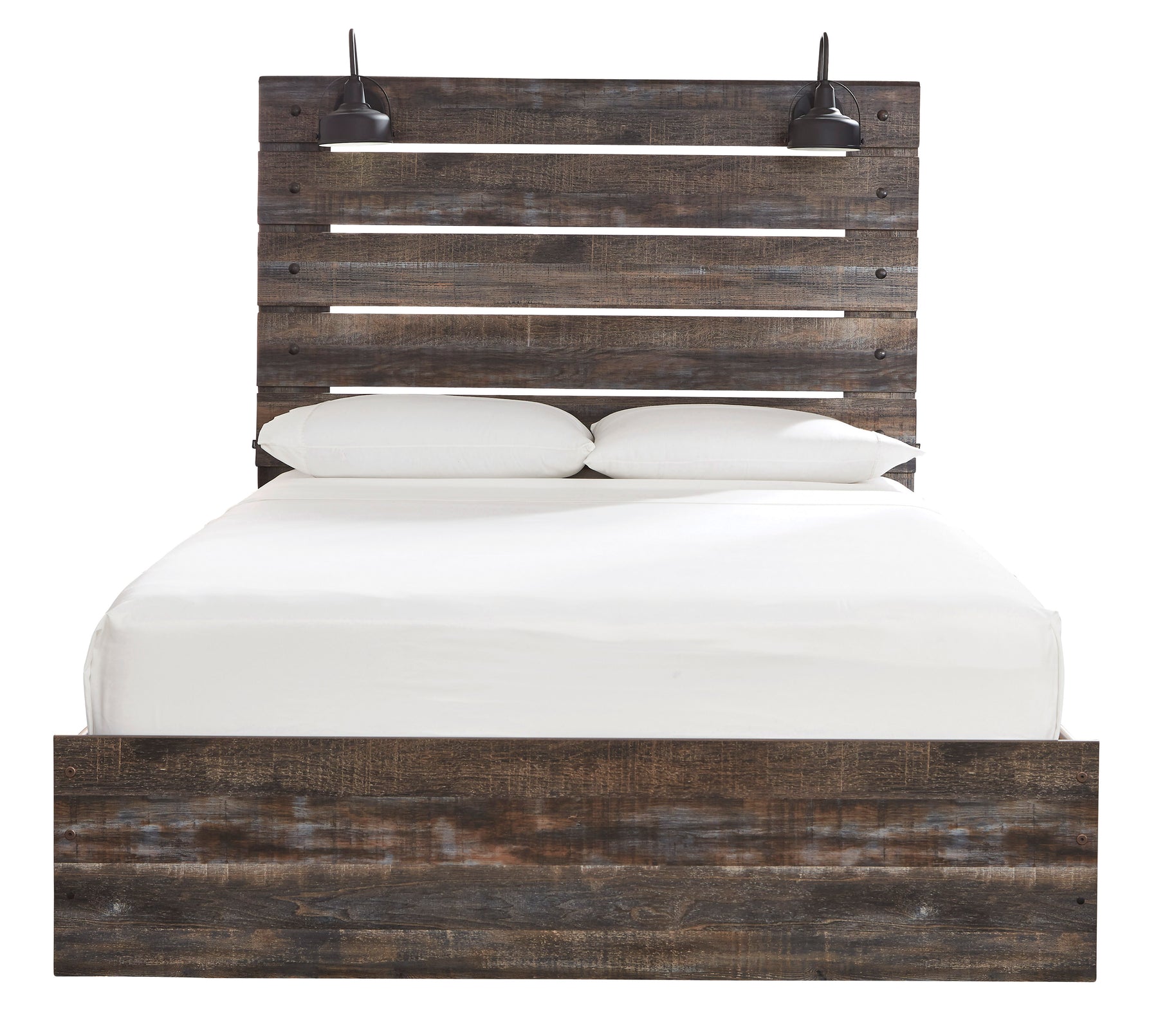 When merged in just the right way, rustic and industrial styles can make one happy marriage. Case in point: this king panel bed. A refined take on barn board beauty, its complex, replicated wood grain showcases hints of burnt orange and teal tones for a sense of weatherworn authenticity. Love to read in bed? You're sure to find the pair of retro-chic light sconces and USB plug-ins on the open-slat style headboard such a bright idea. Mattress and foundation/box spring available, sold separately.
