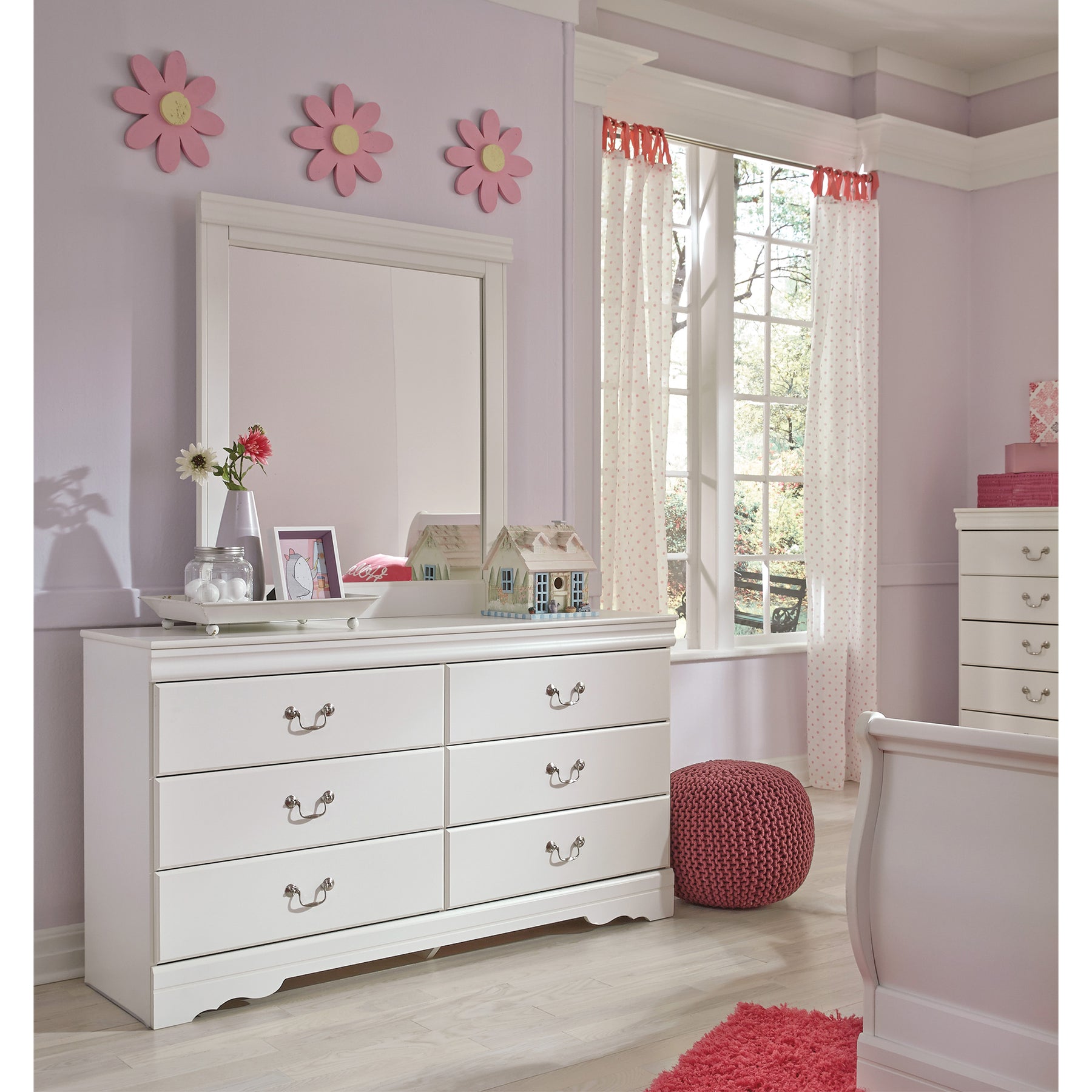 | Details | Includes sleigh bed (with headboard, footboard and rails), dresser and mirror, Made of engineered wood (MDF/particleboard) , Dresser with 6 smooth-gliding drawers, Mirror attaches to back of dresser, Louis Philippe styling, Aged pewter-tone hardware, Assembly required | |