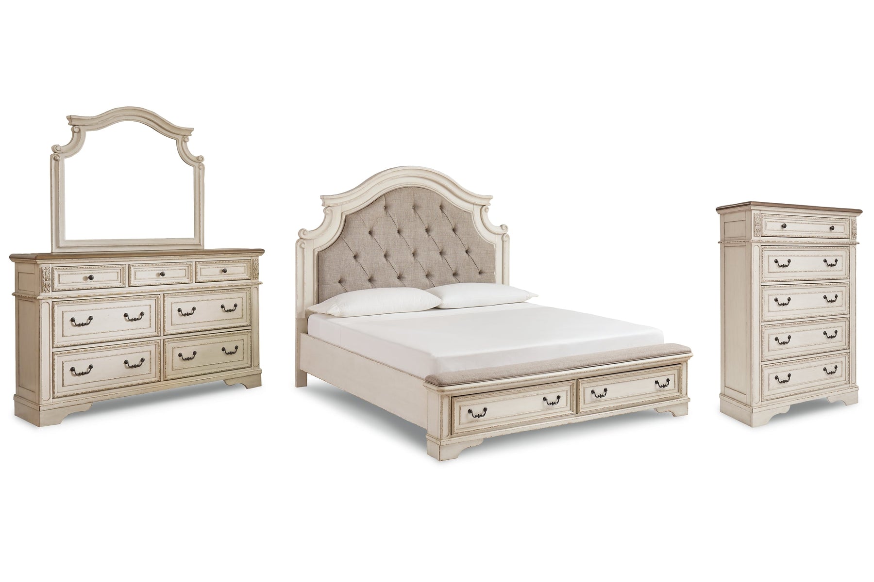 | Details | B743B21: California king upholstered bed (headboard, footboard and panel rails with roll slats), Made with engineered wood and poplar solids, with cast resin components, Chipped white finish, Drawers with dovetail construction and ball bearing side glides, Dark bronze-tone hardware, Footboard with cushioned top rail, Headboard with inset upholstered cushion, Bed does not require additional foundation/box spring; accommodates most zero clearance adjustable bases with the addition of a bunkie board, Mattress available, sold separately, Assembly required, Expert assembly recommended; available at check out for an additional fee, B743B1: Made of veneers, wood and engineered wood, with cast resin components, Antiqued two-tone finish, 7 smooth-gliding drawers with dovetail construction, Dark bronze-tone hardware, Mirror attaches to back of dresser, Assembly required, Includes tipover restraint device, B743-46: Made of veneers, wood and engineered wood, with cast resin components, Antiqued two-tone finish, Dark bronze-tone finished metal hardware, 5 smooth-gliding drawers with dovetail construction, Includes tipover restraint device, Small Space Solution, Includes tipover restraint device, | |