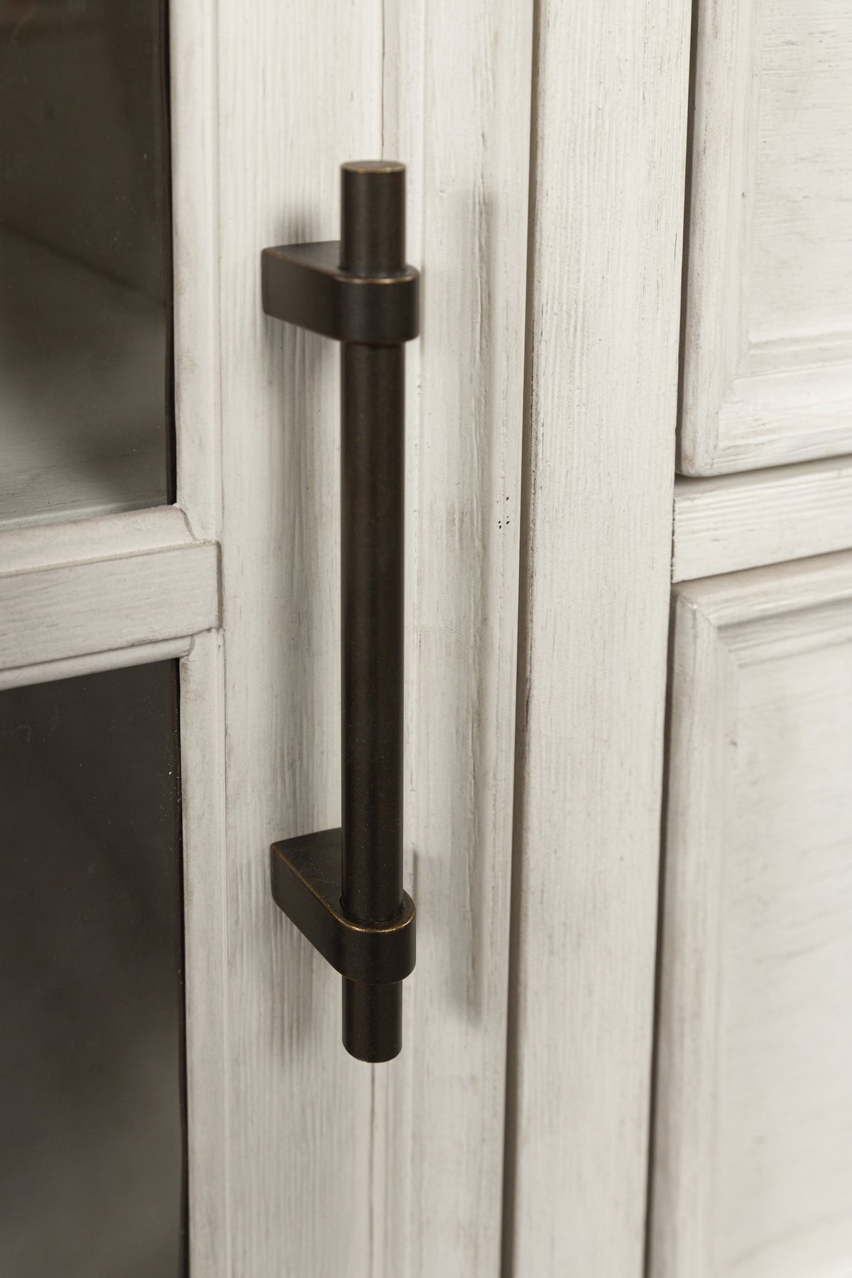 Details B683B6: Includes panel headboard, footboard, rails and slats, Made with hardwood solids, veneers and MDF substrates, Two-tone finish (antiqued white and light gray wood tone), Foundation/box spring required, sold separately, Mattress available, sold separately, Assembly required, B683B1: Includes dresser and mirror, Made with hardwood solids, veneers and MDF substrates, Two-tone finish (antiqued white and light gray wood tone), Dark bronze-tone bar pulls, 2 glass-front cabinets, each with single storage shelf, 5 drawers with fully finished interior, dovetail construction and heavy duty ball-bearing side glides (top drawer felt lined), Mirror attaches to back of dresser,