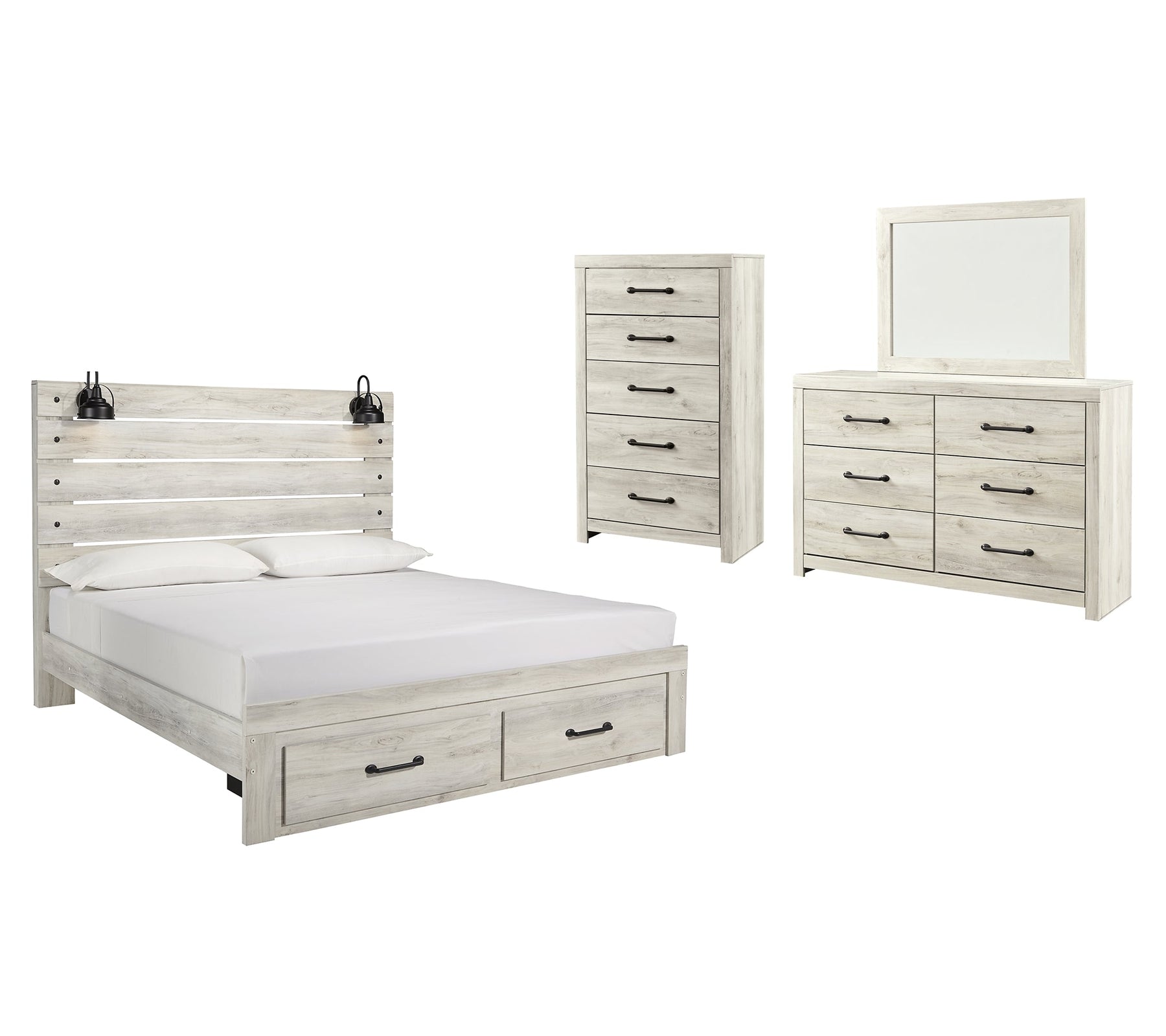 | Details | B192-46: Made of engineered wood (MDF/particleboard) and decorative laminate, Wispy white finish over replicated oak grain with authentic touch, Large-scale hardware with dark finish, 5 smooth-gliding drawers, Drawer interiors are lined with a faux linen laminate for a clean, finished look, Safety is a top priority, clothing storage units are designed to meet the most current standard for stability, ASTM F 2057 (ASTM International), Drawers extend out to accommodate maximum access to drawer interior while maintaining safety, B192B1: Includes dresser with mirror, Made of engineered wood (MDF/particleboard) and decorative laminate, Wispy white finish over replicated oak grain with authentic touch, 6 smooth-gliding drawers, Drawer interiors are lined with a faux linen laminate for a clean, finished look, Large-scale hardware with dark finish, Mirror attaches to back of dresser, Assembly required, B192B8: Includes headboard, footboard and rails, Made of engineered wood (MDF/particleboard) and decorative laminate, Wispy white finish over replicated oak grain with authentic touch, Large-scale hardware with dark finish, 2 decorative sconce lights, LED with 3 AA batteries, 2 smooth-gliding storage drawers, 2 slim-profile USB charging ports, Power cord included; UL-listed, Foundation/box spring required, sold separately, Mattress available, sold separately, Assembly required, Bed is not compatible with an adjustable base, | |
