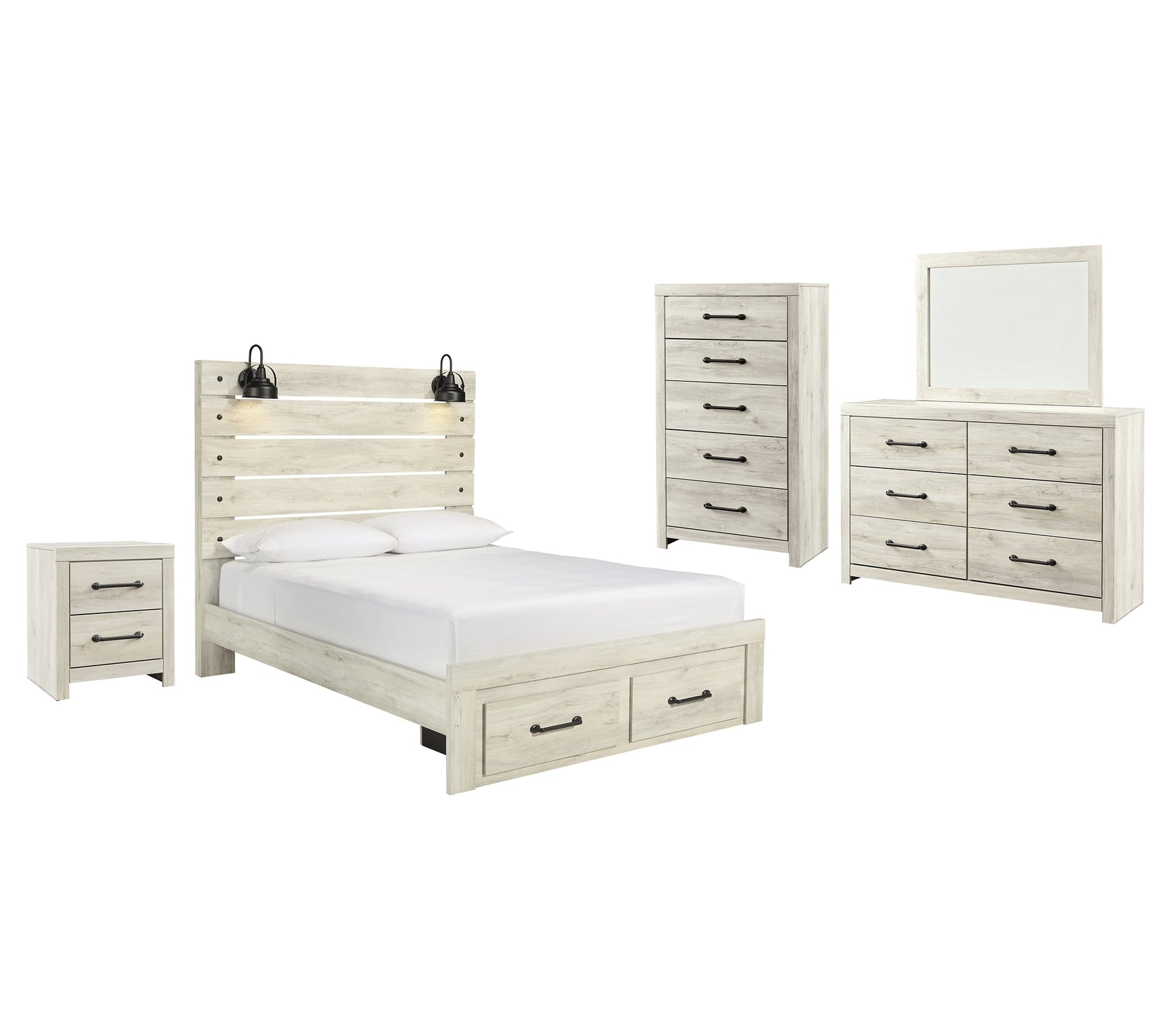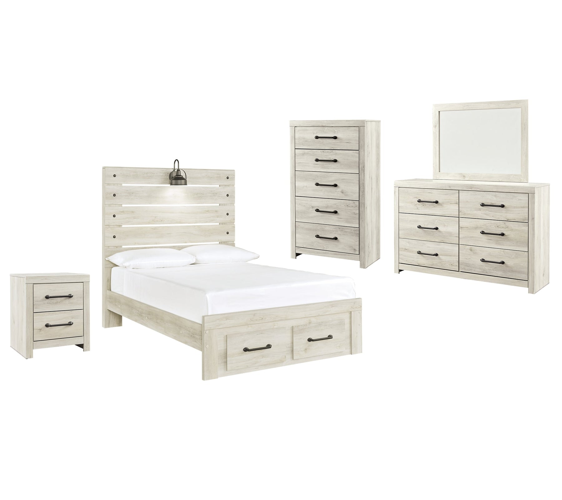 Details B192-46: Made of engineered wood (MDF/particleboard) and decorative laminate, Wispy white finish over replicated oak grain with authentic touch, Large-scale hardware with dark finish, 5 smooth-gliding drawers, Drawer interiors are lined with a faux linen laminate for a clean, finished look, Safety is a top priority, clothing storage units are designed to meet the most current standard for stability, ASTM F 2057 (ASTM International), Drawers extend out to accommodate maximum access to drawer interior while maintaining safety, B192-92: Made of engineered wood (MDF/particleboard) and decorative laminate, Wispy white finish over replicated oak grain with authentic touch, Large-scale hardware with dark finish, 2 smooth-gliding drawers, Drawers lined with faux linen laminate for finished aesthetic, 2 slim-profile USB charging stations, Power cord included; UL Listed, B192B1: Includes dresser with mirror, Made of engineered wood (MDF/particleboard) and decorative laminate, Wispy white finish over replicated oak grain with authentic touch, 6 smooth-gliding drawers, Drawer interiors are lined with a faux linen laminate for a clean, finished look, Large-scale hardware with dark finish, Mirror attaches to back of dresser, Assembly required, B192B8: Includes headboard, footboard and rails, Made of engineered wood (MDF/particleboard) and decorative laminate, Wispy white finish over replicated oak grain with authentic touch, Large-scale hardware with dark finish, 2 decorative sconce lights, LED with 3 AA batteries, 2 smooth-gliding storage drawers, 2 slim-profile USB charging ports, Power cord included; UL-listed, Foundation/box spring required, sold separately, Mattress available, sold separately, Assembly required, Bed is not compatible with an adjustable base,