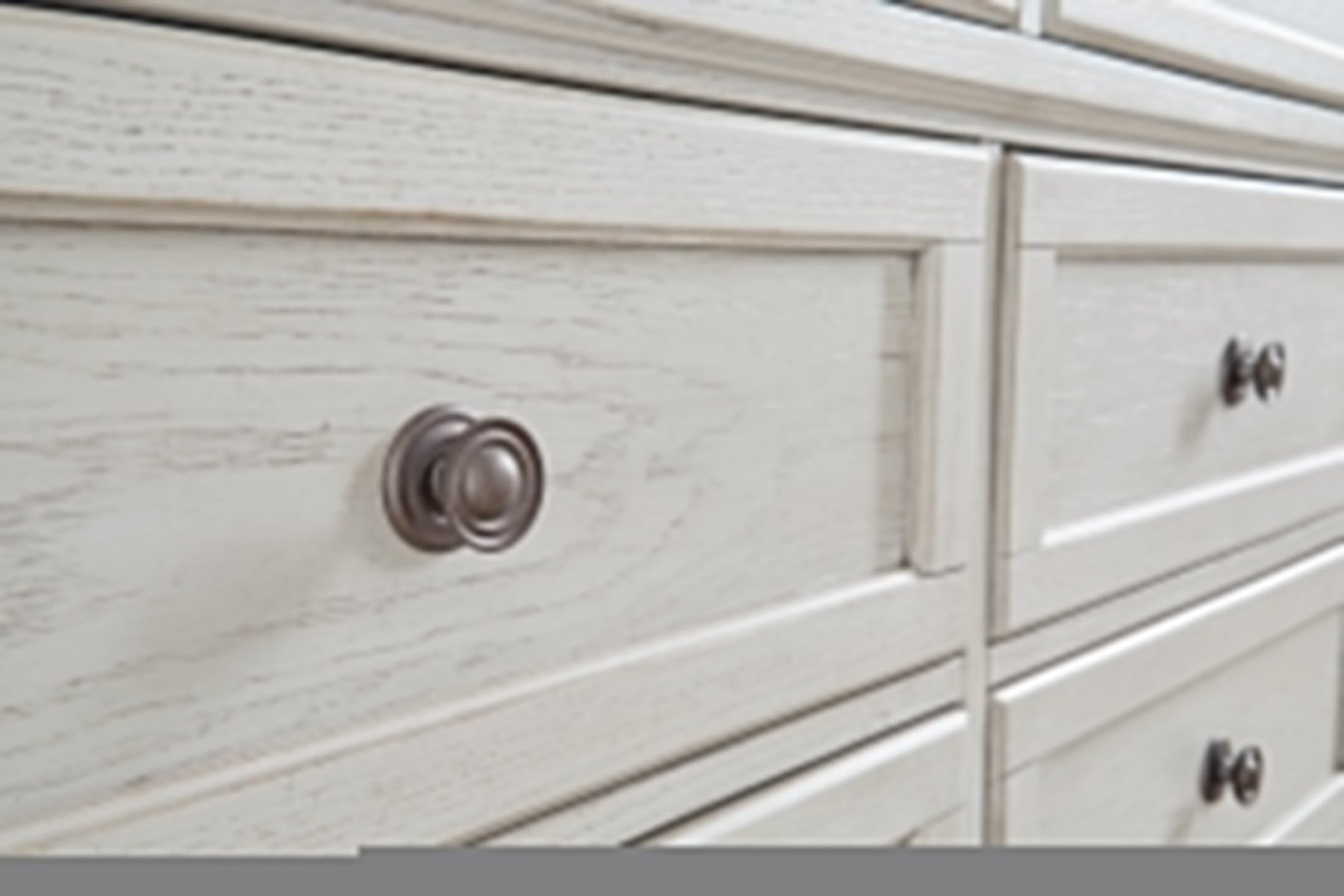 | Details | B742B2: Includes headboard, footboard and rails, Made with select oak veneer, engineered wood, solid wood components and cast resin components, Antiqued white finish with grain texture, Headboard can attach to metal bed frames, Foundation/box spring required, sold separately , Mattress available, sold separately , Assembly required, Bed is compatible with an adjustable base, B742B1: Includes dresser and mirror, Made with select oak veneer, engineered wood, solid wood components and cast resin components, Antiqued white finish with grain texture, 7 smooth-gliding drawers with dovetail construction and metal ball bearing side glides (pull-out tray and top drawers felt lined), Dark bronze-tone knobs, Mirror attaches to back of dresser, Assembly required, | |