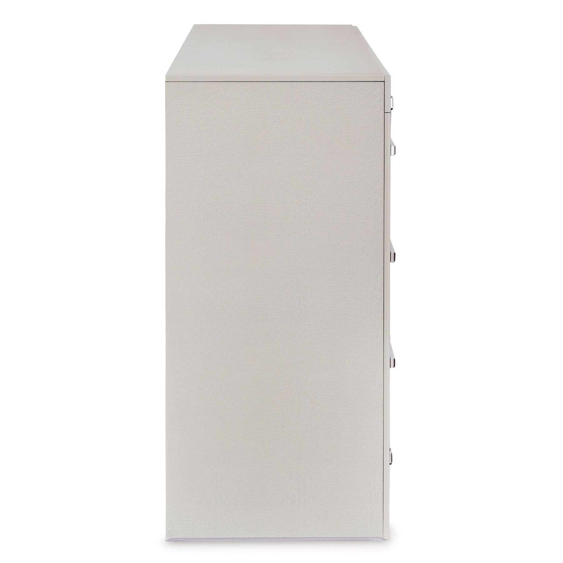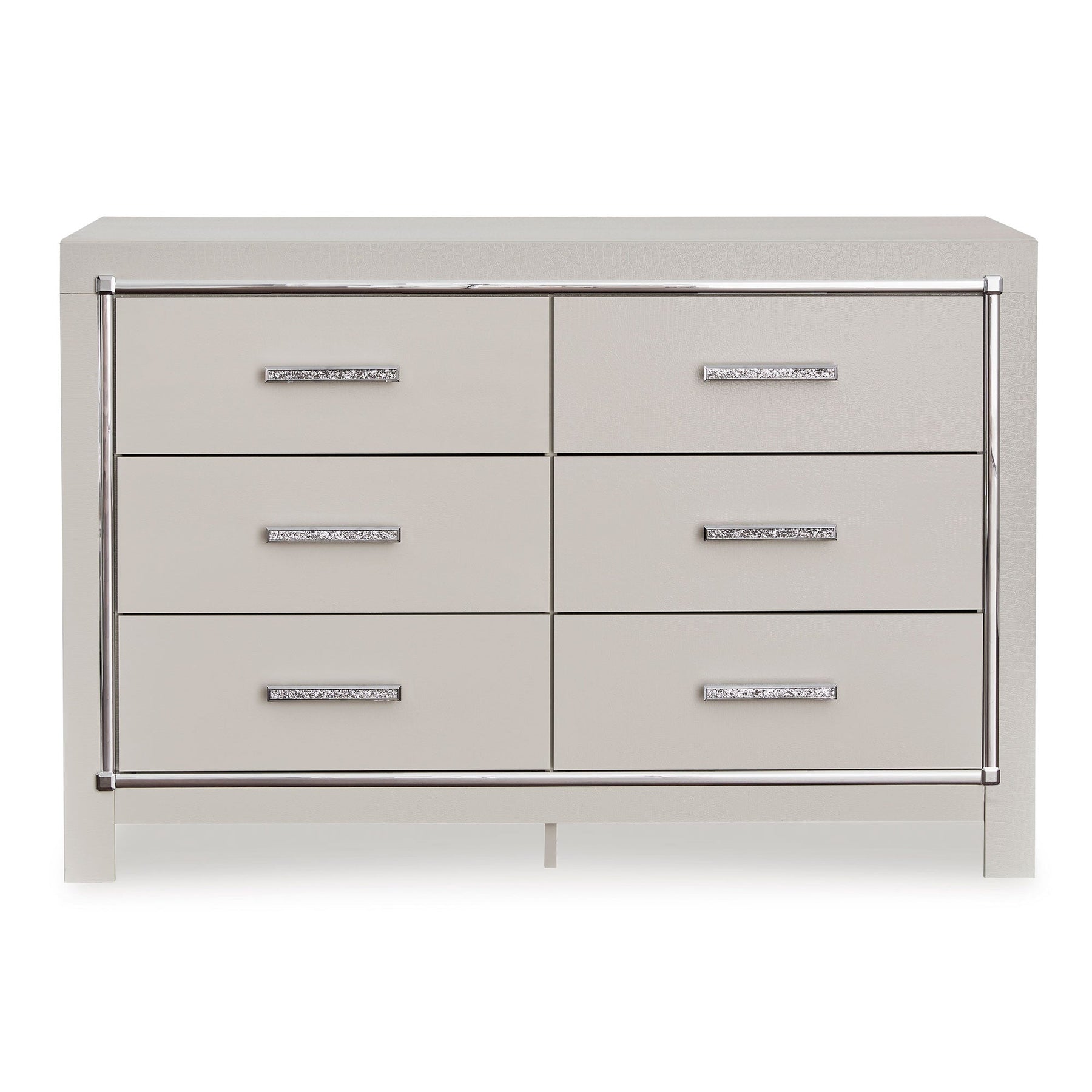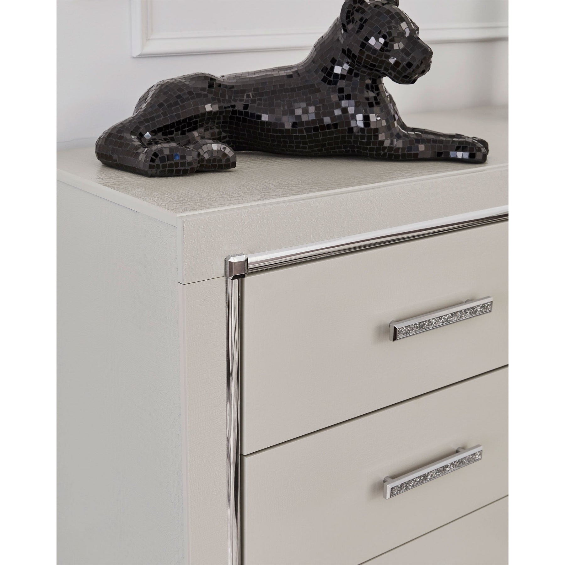 The mirrored dresser complements the bed's grandeur, wrapped in a silvertone pearl finish that mimics faux gator skin, and adorned with faceted chrome-tone details that reflect the light in the most dazzling ways. Its six drawers, equipped with smooth-gliding mechanisms and faux crystal handles, offer ample storage space while maintaining the set's luxurious aesthetic. The dresser's mirror, enhanced with LED lighting, can be adjusted for brightness and color, ensuring that your setting is always shown in the best light, whether you're dressing up or down.