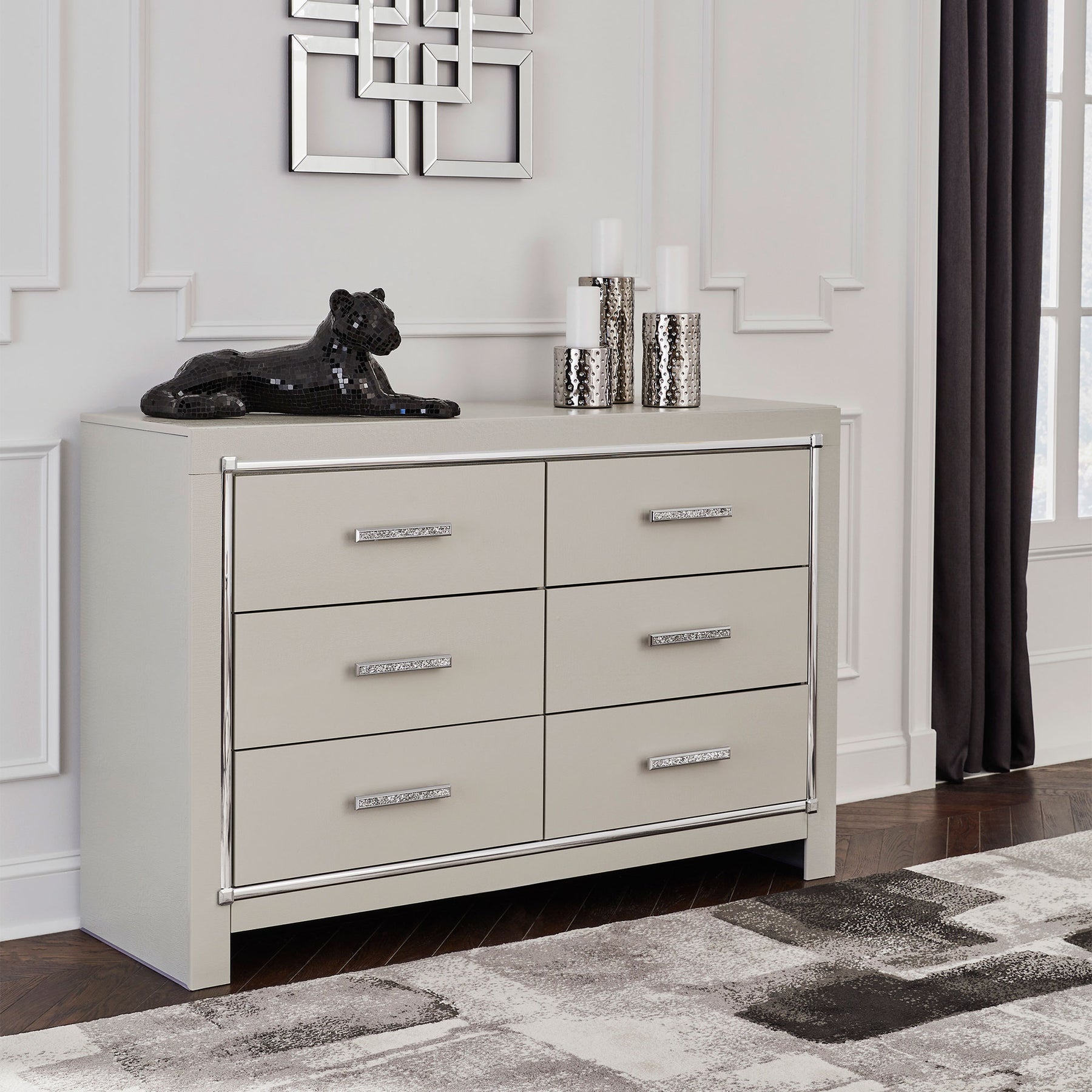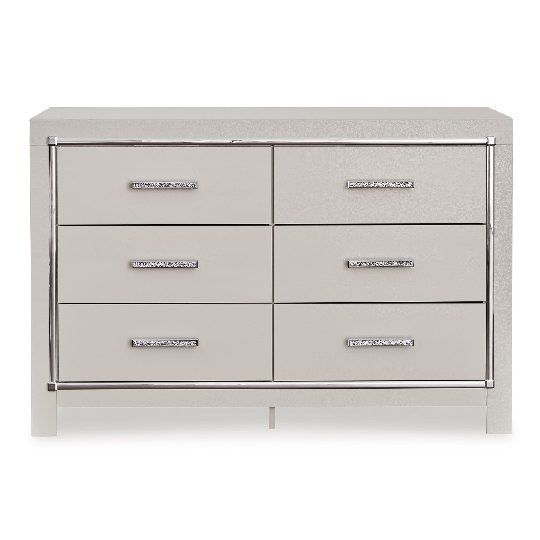 Choose the Zyniden Queen Panel Bed with Mirrored Dresser for a bedroom that dazzles with glamour, inviting you to live luxuriously every day.