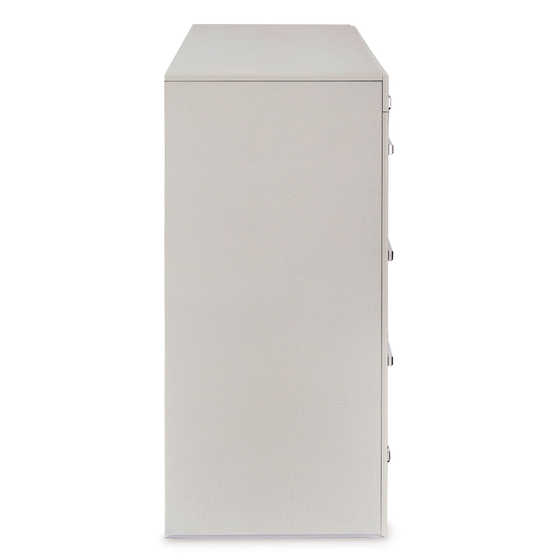The dresser, with its all-over faux gator in a metallic silvertone pearl finish, is a masterpiece of design, beautifully complemented by faceted chrome-tone details and handles adorned with faux crystal accents. It features six smooth-gliding drawers lined with faux linen laminate, offering ample storage space with a touch of elegance. The highlight is the LED lighting around the mirror, which comes with a remote for color and brightness options, ensuring you always have the perfect lighting to match your mood.